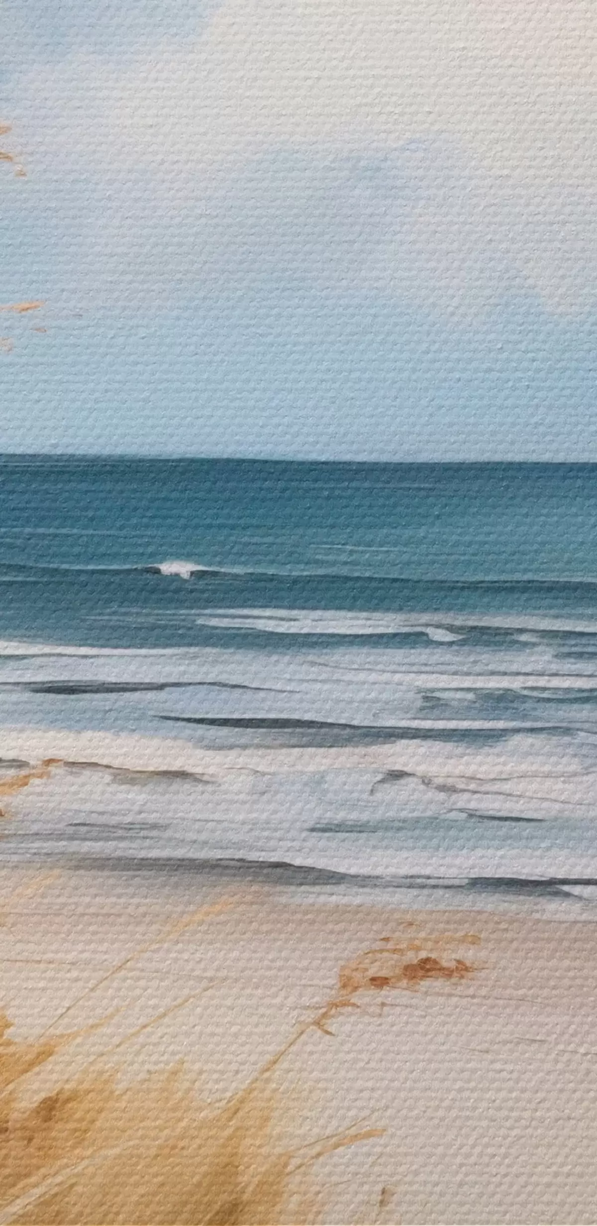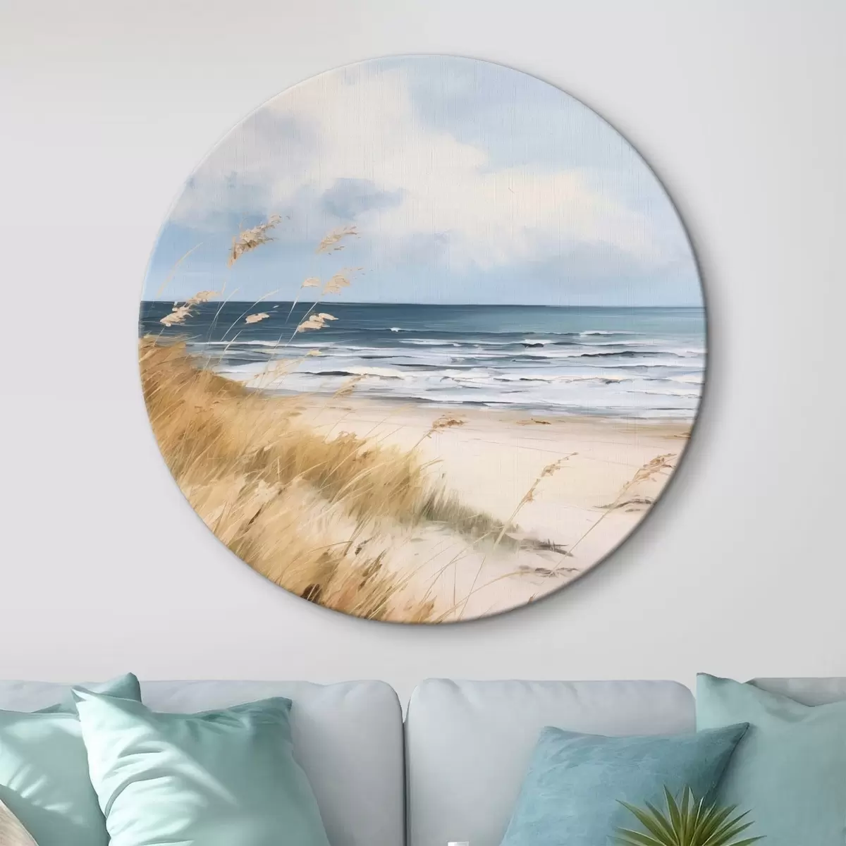 Ronde schilderijen Een zandstrand met hoog gras op de voorgrond, de oceaan met golven en een bewolkte lucht op de achtergrond Nr r45174