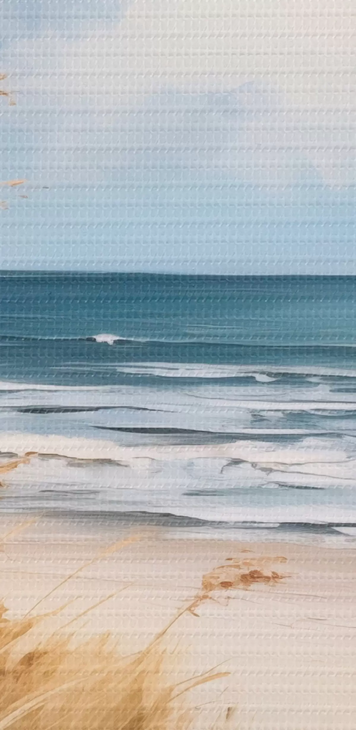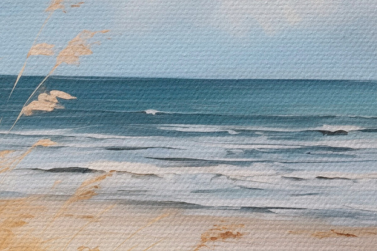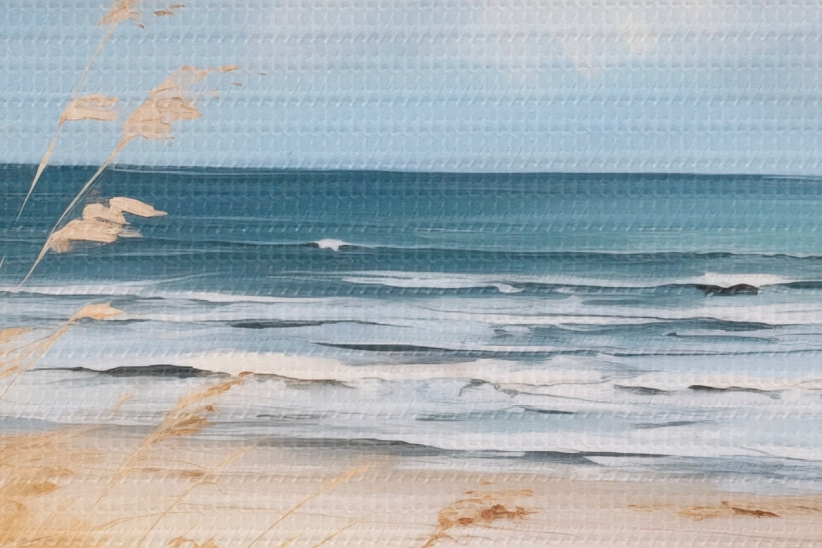 Ronde schilderijen Een zandstrand met hoog gras op de voorgrond, de oceaan met golven en een bewolkte lucht op de achtergrond r45174