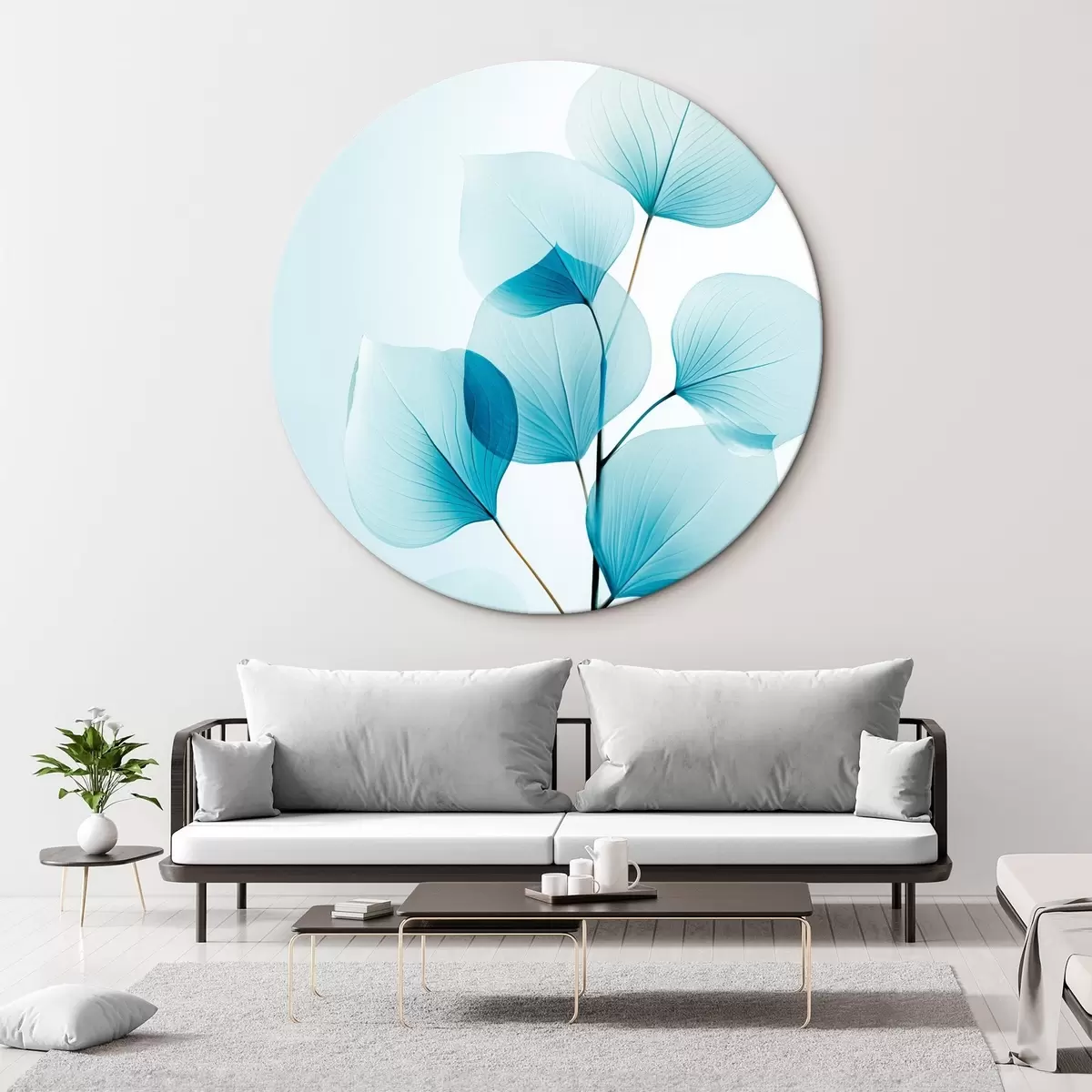 Ronde schilderijen Tak met doorschijnende blauwe bladeren, fijne nerven zichtbaar, lichte en rustige compositie, minimalistische esthetiek r45175