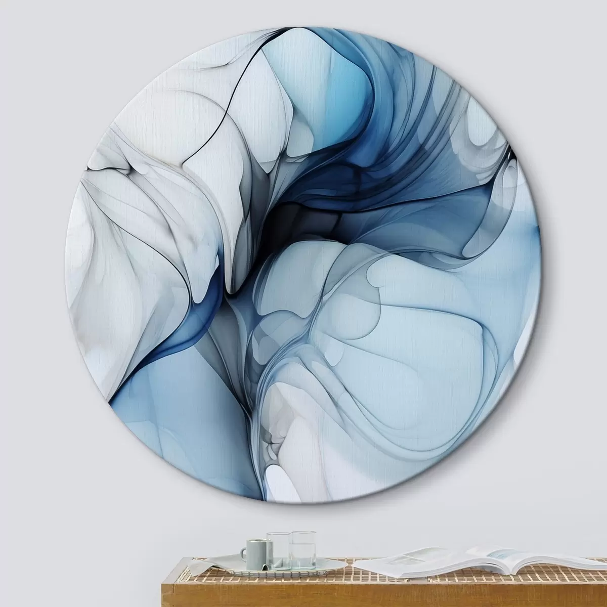 Ronde schilderijen Abstracte compositie met vloeiende lijnen en doorschijnende bloemblaadjes in blauwwitte en beige tinten, imitatie van alcoholinkt Nr r45178