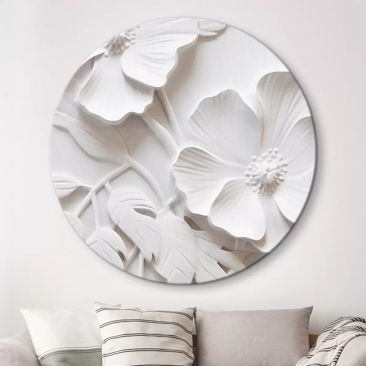 Ronde schilderijen Decoratieve minimalistische witte bloemen met bladeren, reliëfimitatie, witte achtergrond r45179