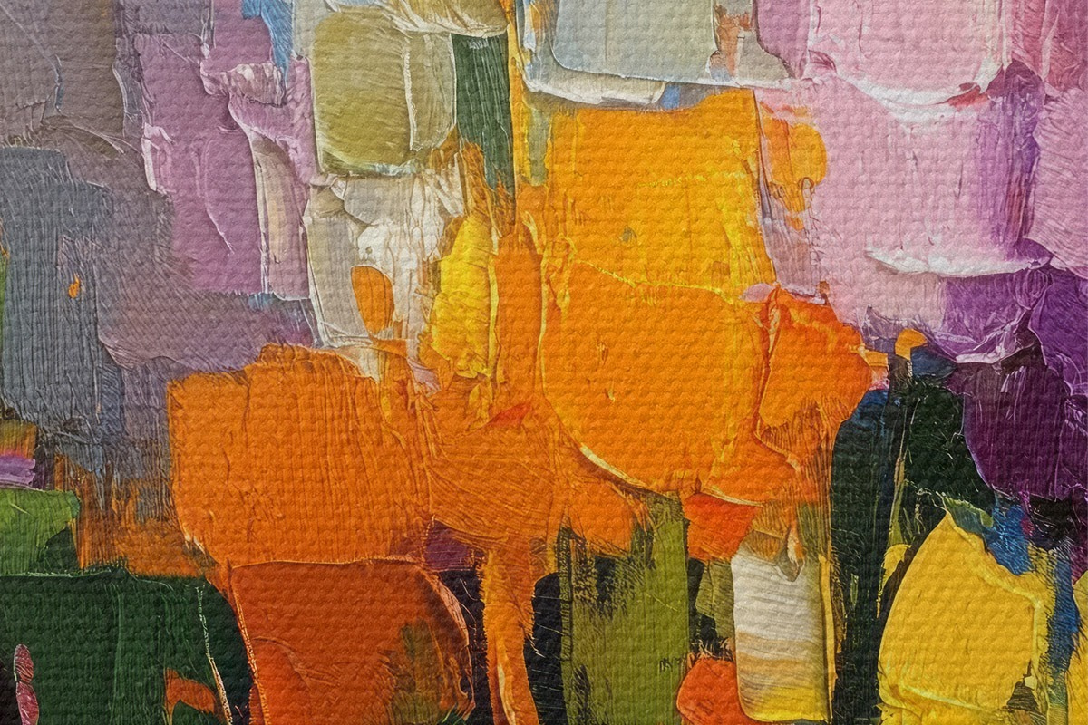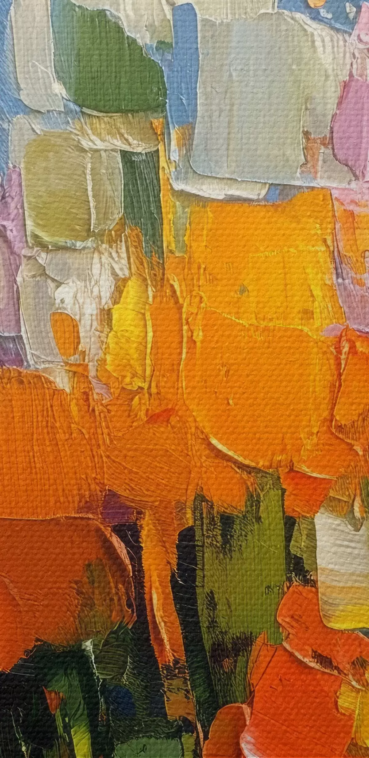 Het schilderij kan direct na ontvangst worden opgehangen. Het schilderij wordt opgespannen op een 2 cm breed houten spieraam.