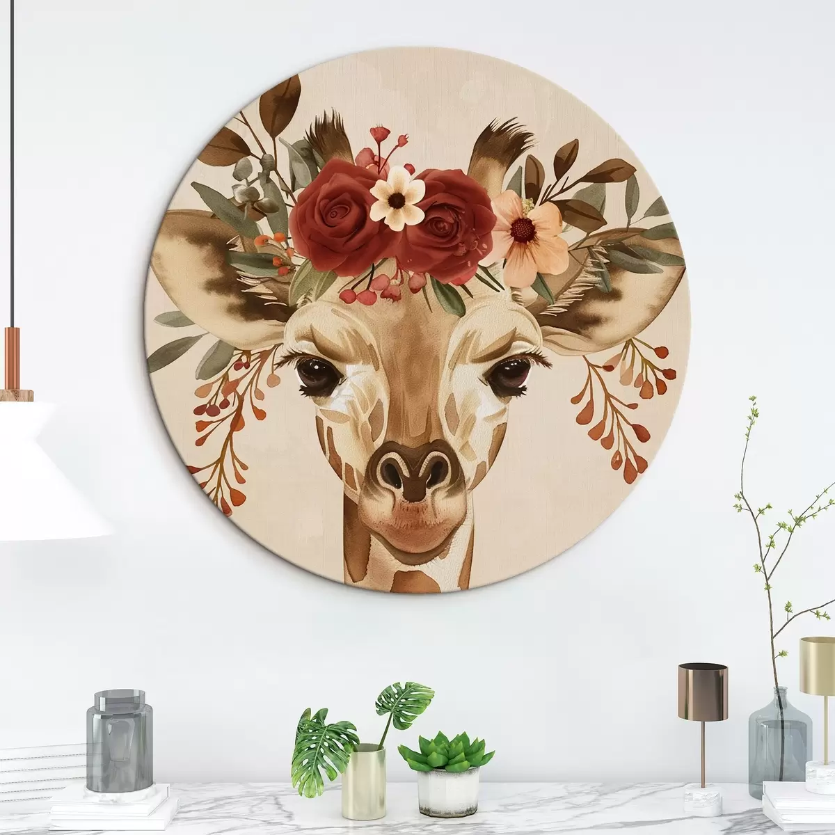 Ronde schilderijen Giraffe in aquarelstijl met bloemen op zijn hoofd Nr r45331