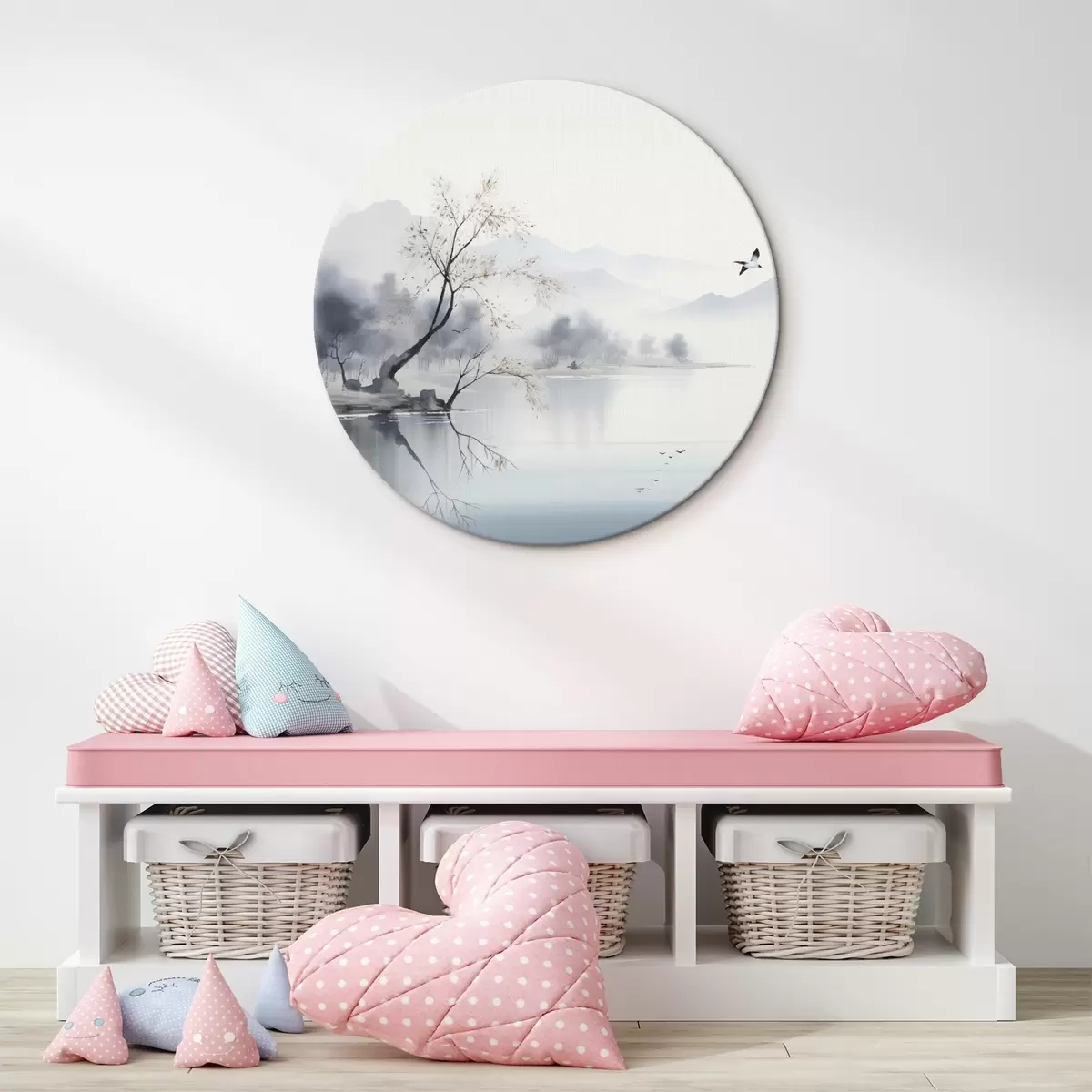 Ronde schilderijen Mistig landschap met een boom, bergen en vogels Nr r45518
