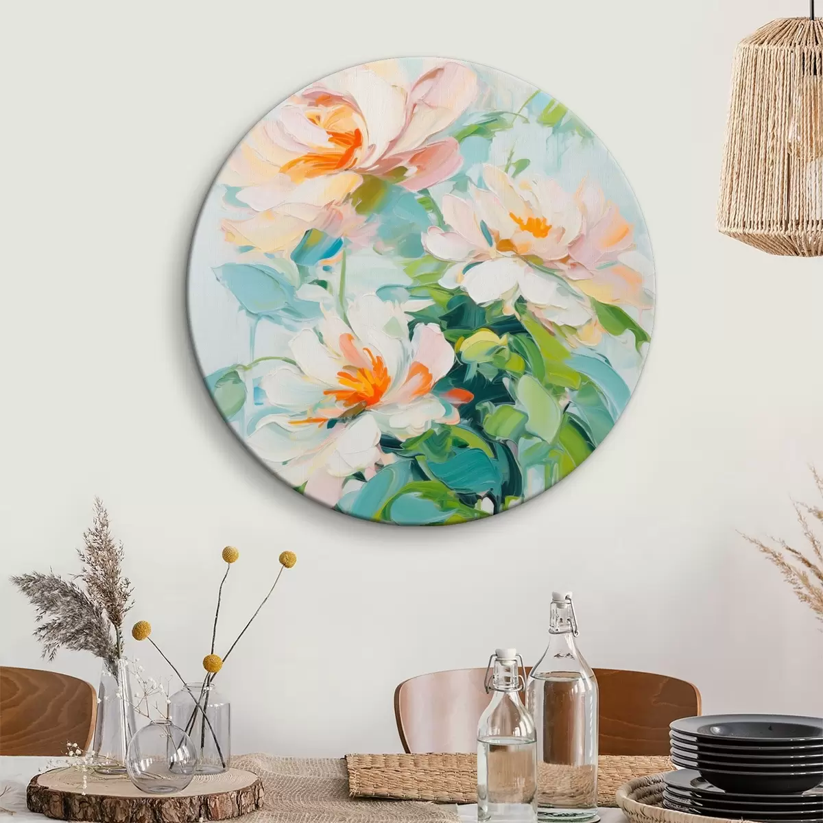 Ronde schilderijen Witte en pastel perzik bloemen, groene bladeren, zachte penseelstreken olieverf imitatie, lichtblauwe achtergrond Nr r45550