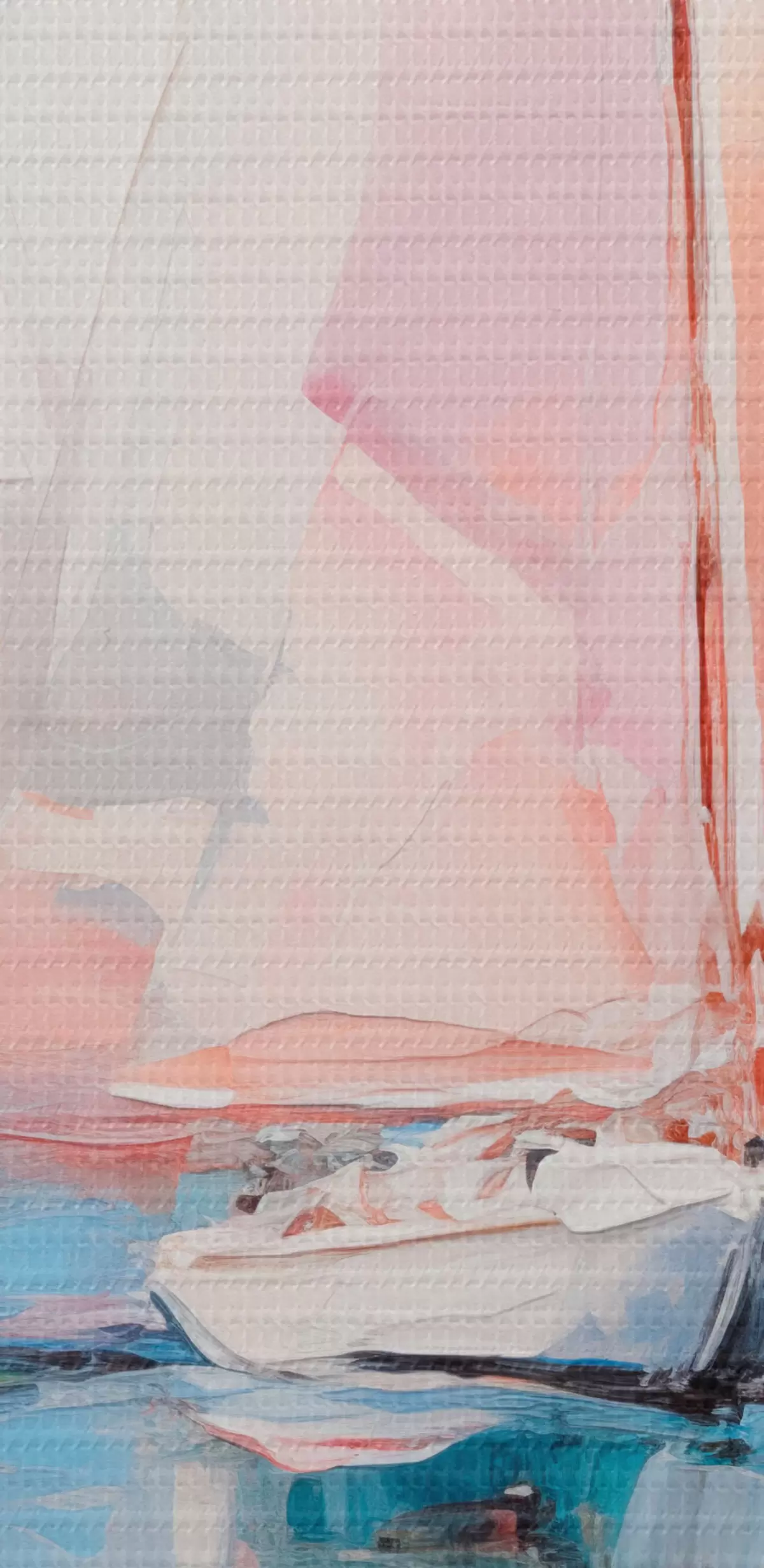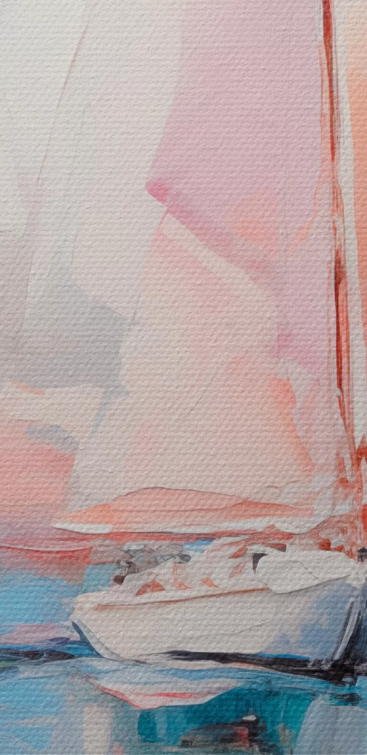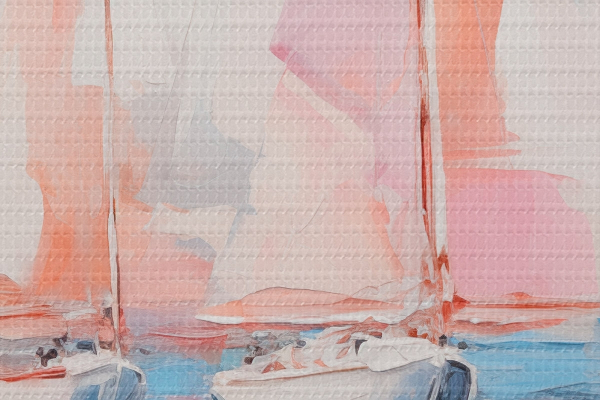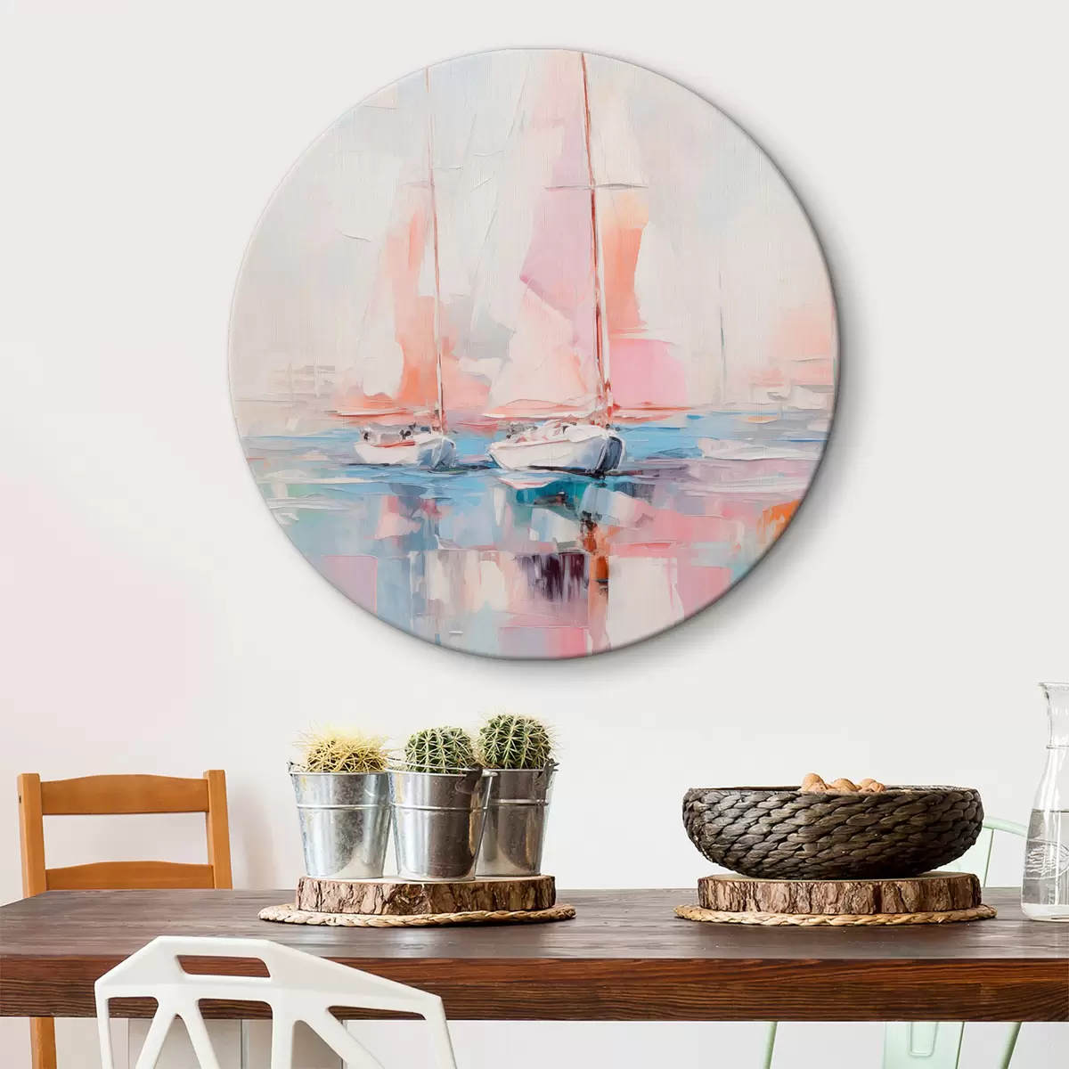 Ronde schilderijen Zeilboten met roze zeilen drijvend op een kalme zee, reflecties van de boten in het water, zachte pastelkleuren Nr r45557