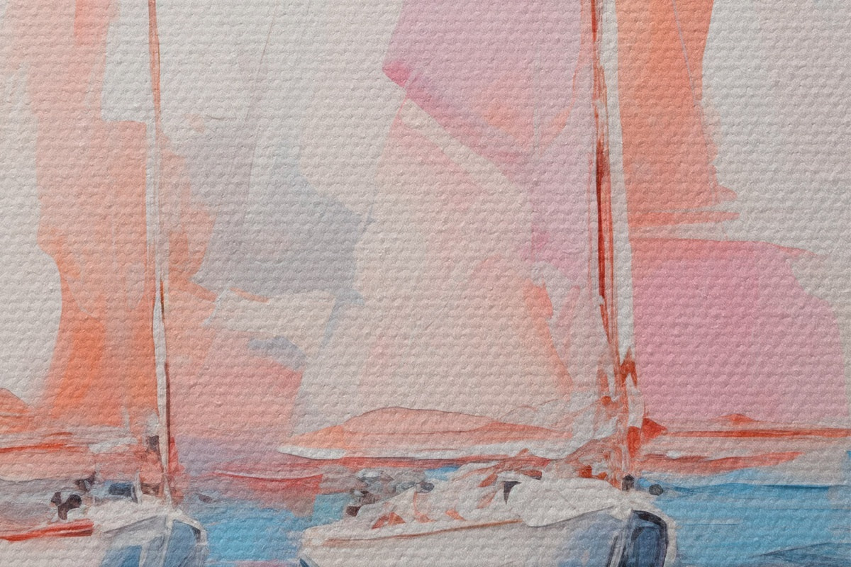 Ronde schilderijen Zeilboten met roze zeilen drijvend op een kalme zee, reflecties van de boten in het water, zachte pastelkleuren r45557