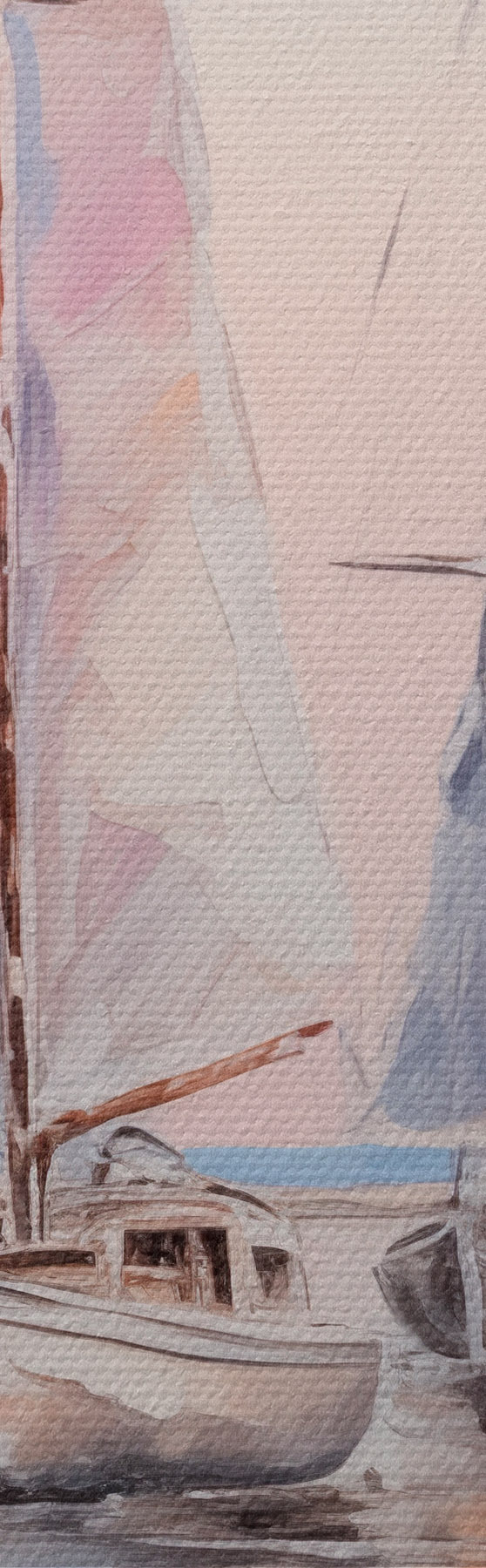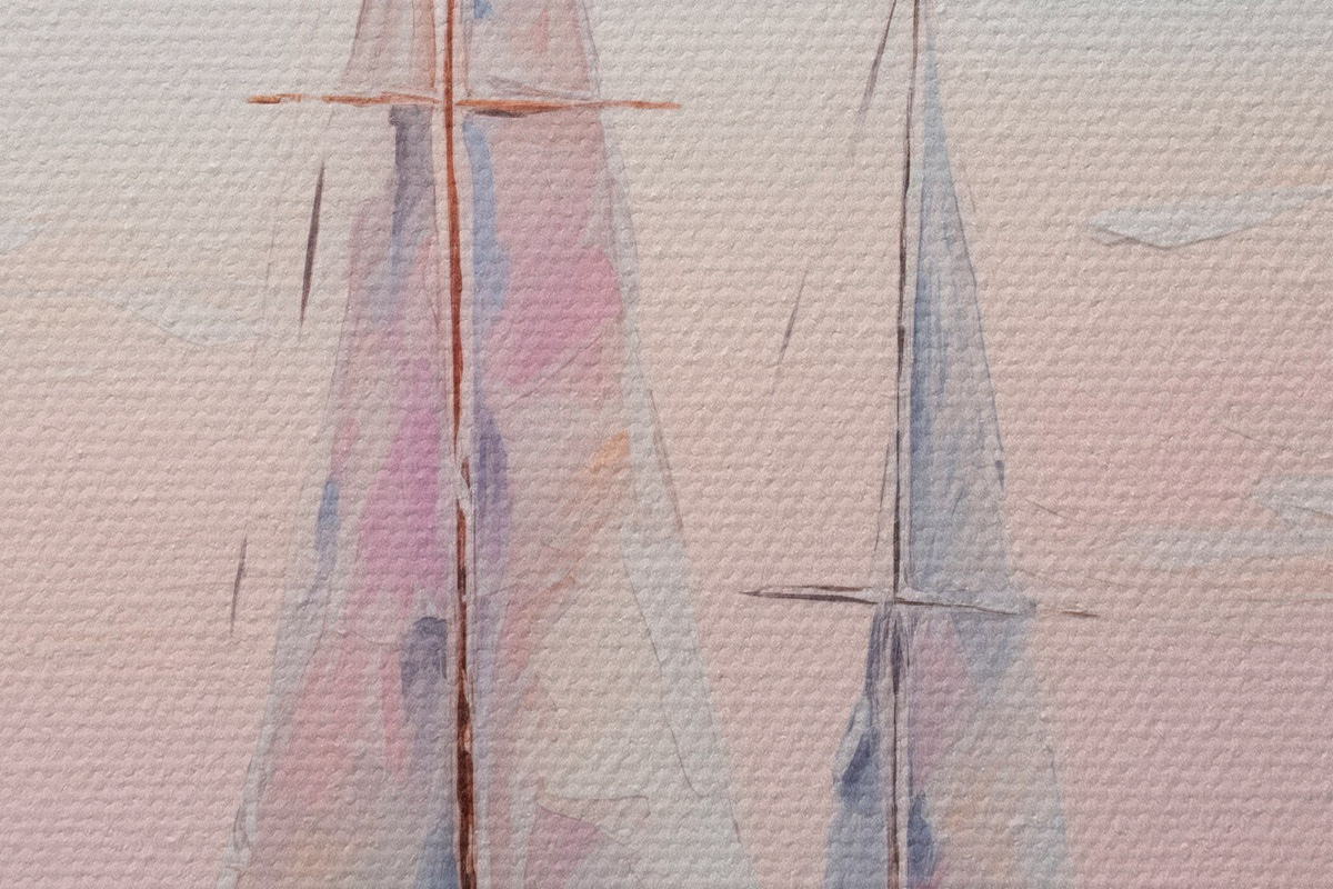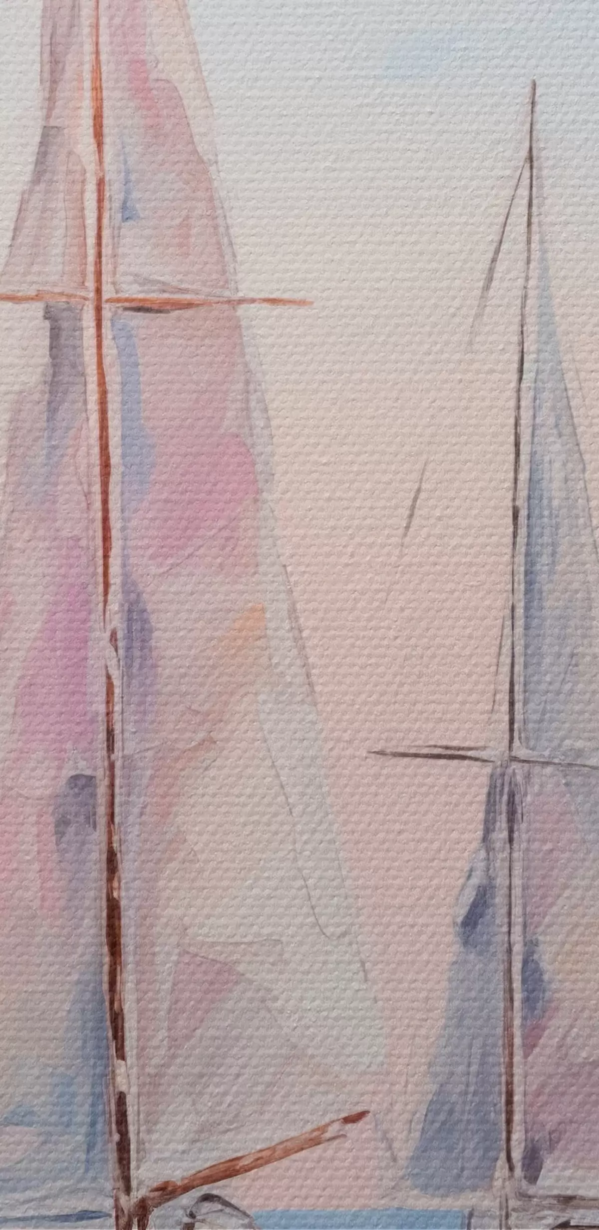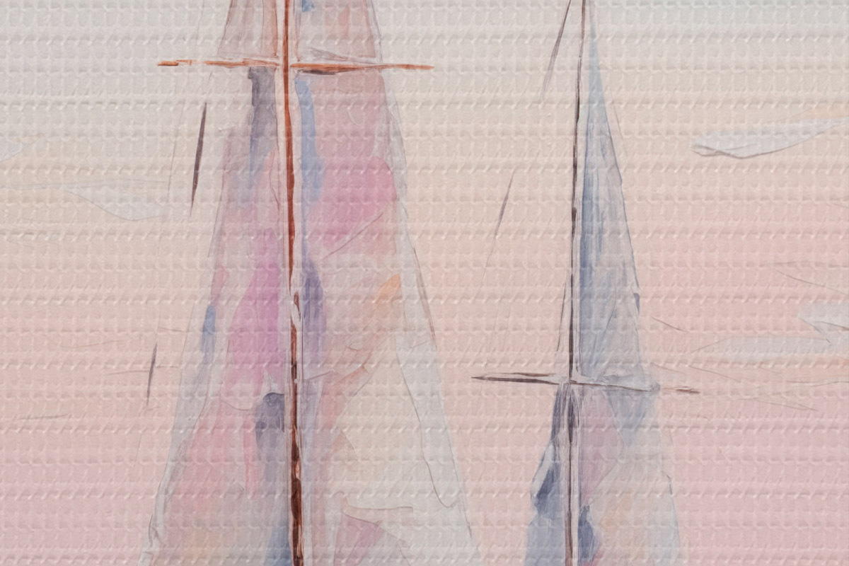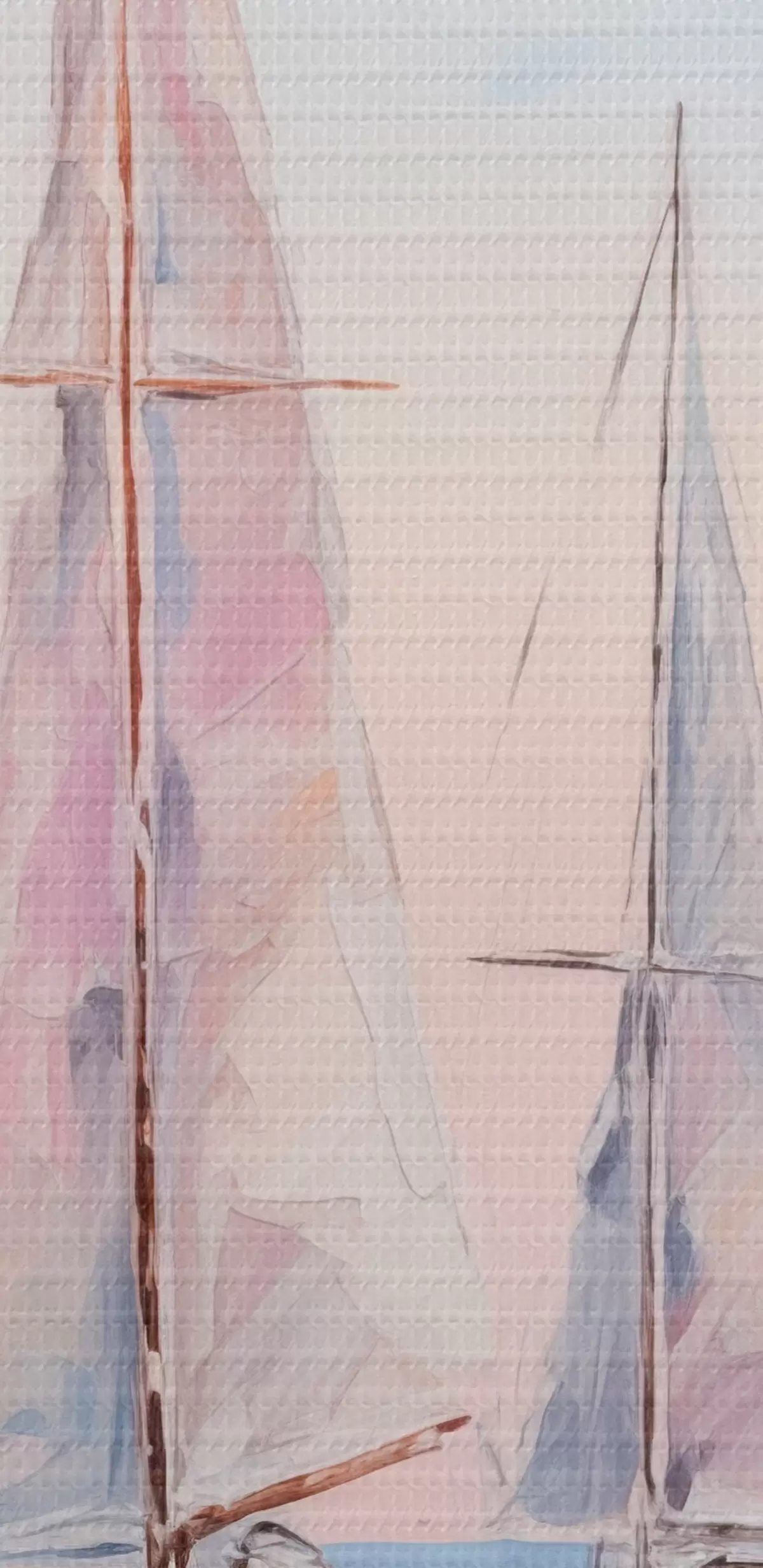 Ronde schilderijen Zeilboten met roze zeilen drijvend op een kalme zee, reflecties van de boten in het water, zachte pastelkleuren Nr r45558