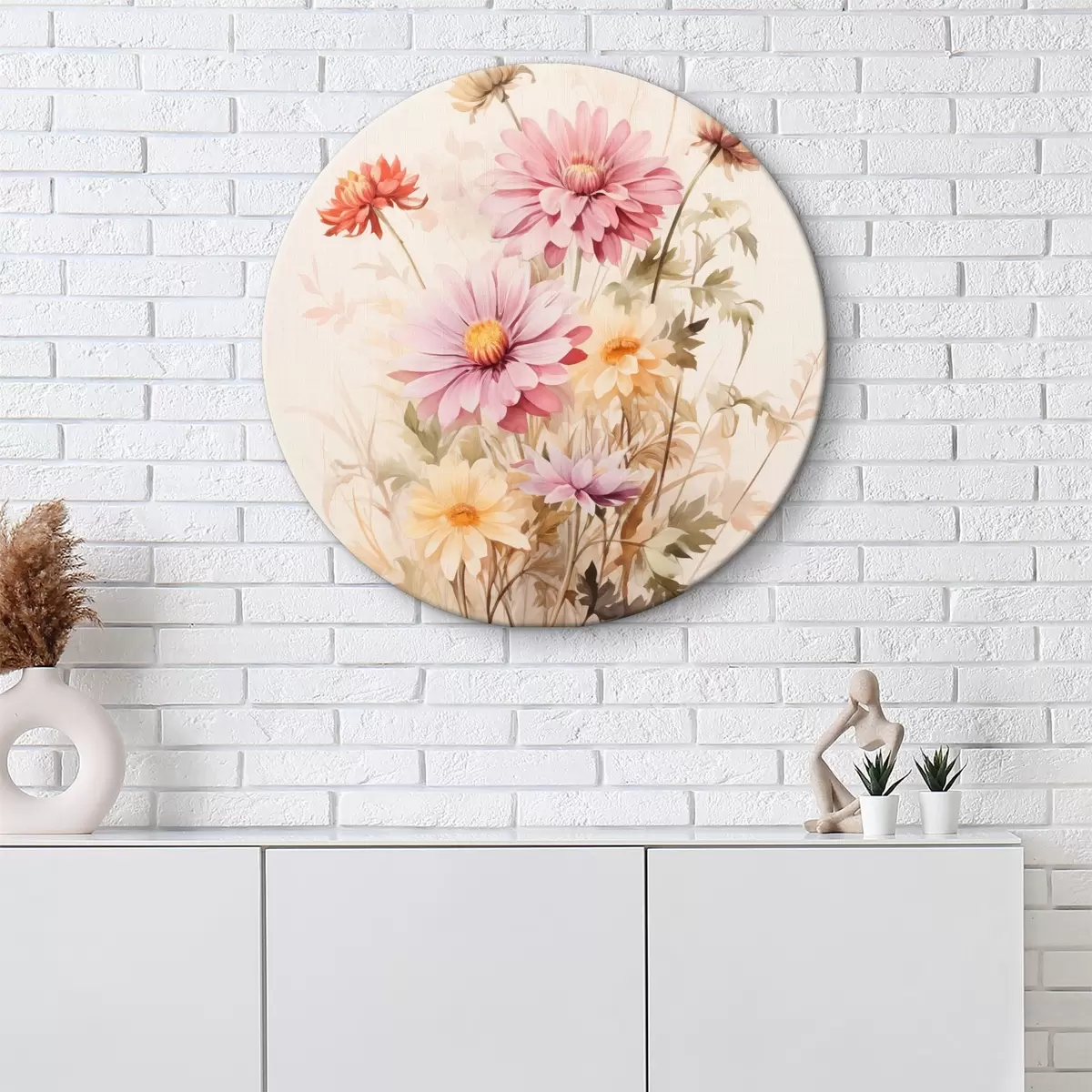 Ronde schilderijen Een boeket kleurrijke bloemen, zachte aquarel stijl, op een lichte achtergrond, botanische illustratie Nr r45560