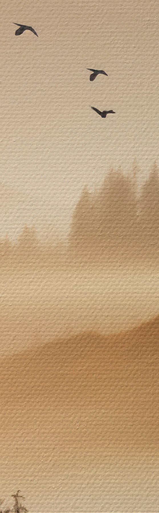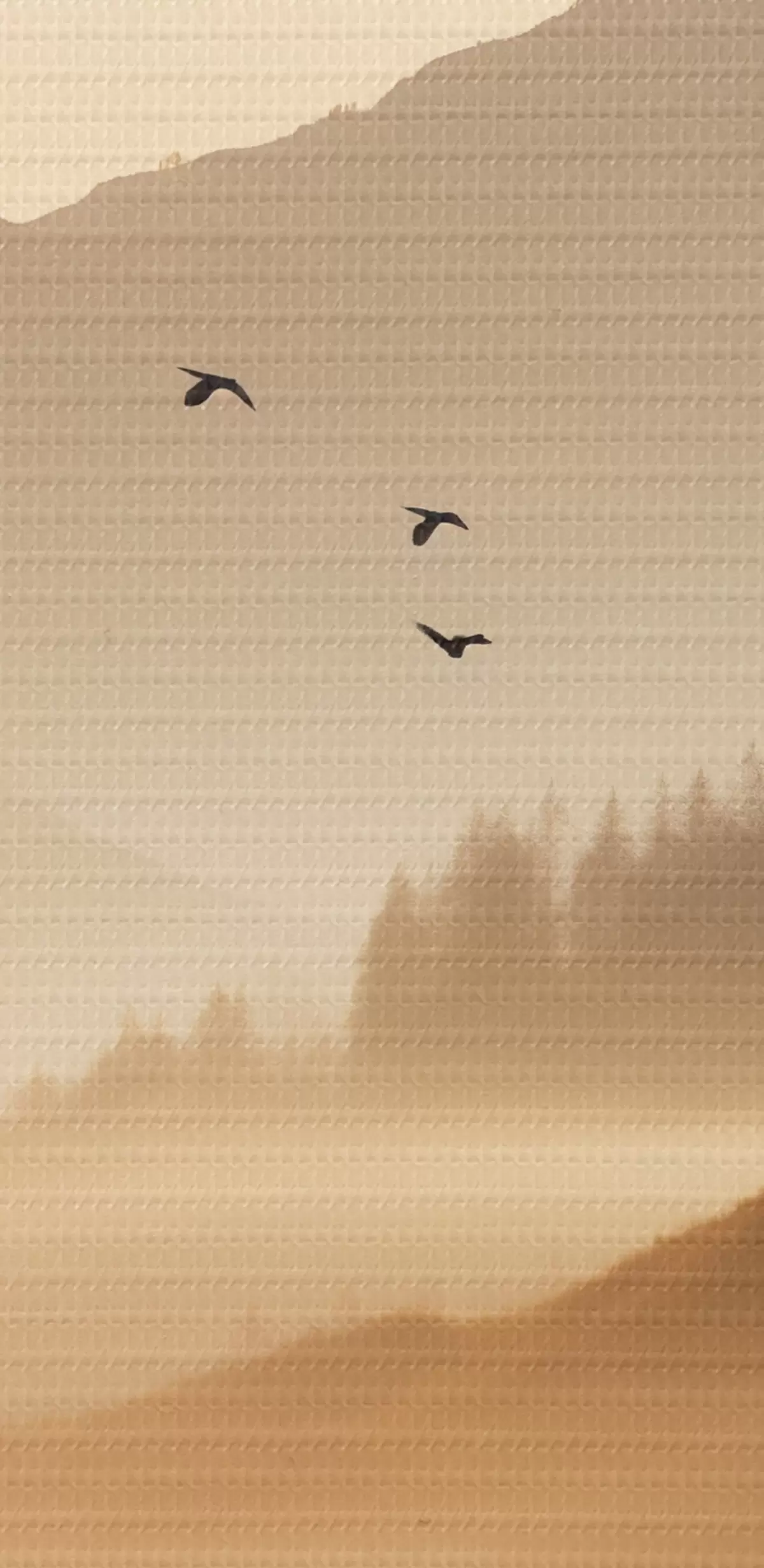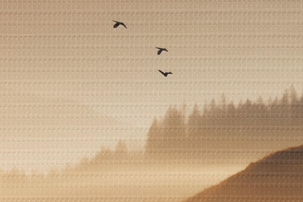 Ronde schilderijen Een berglandschap met een bos en vogels die in de lucht vliegen, alles bedekt met een dikke laag mist tijdens zonsopgang Nr r45563