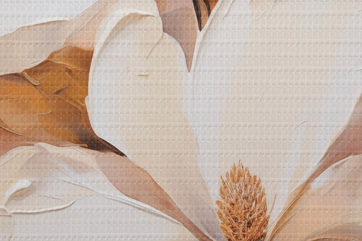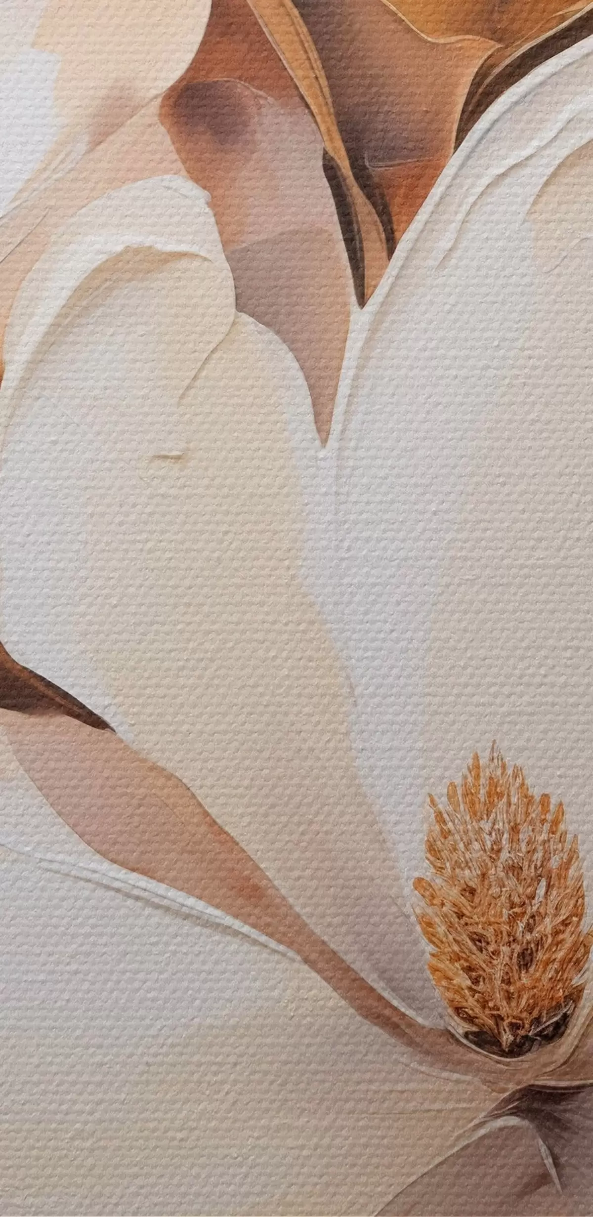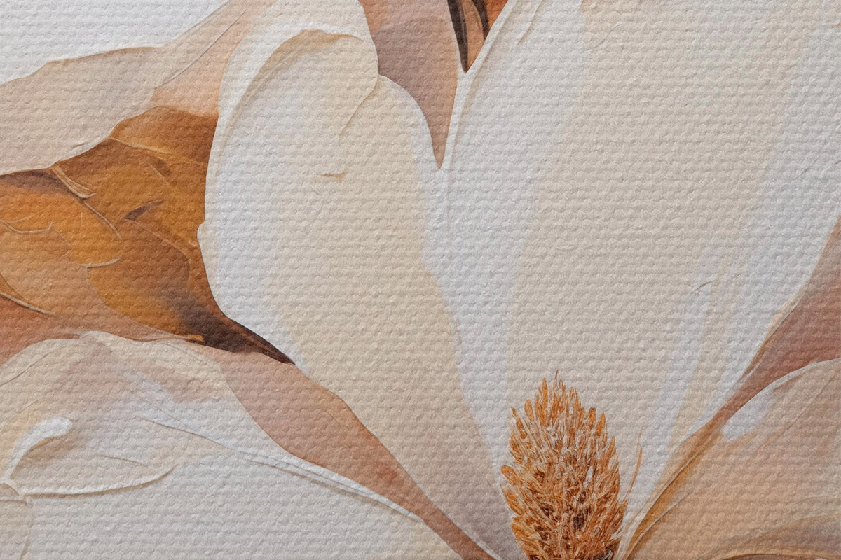 Ronde schilderijen Witte magnoliabloemen tegen een zachte, onscherpe achtergrond van beige en bruine tinten, schilderstijl r45572