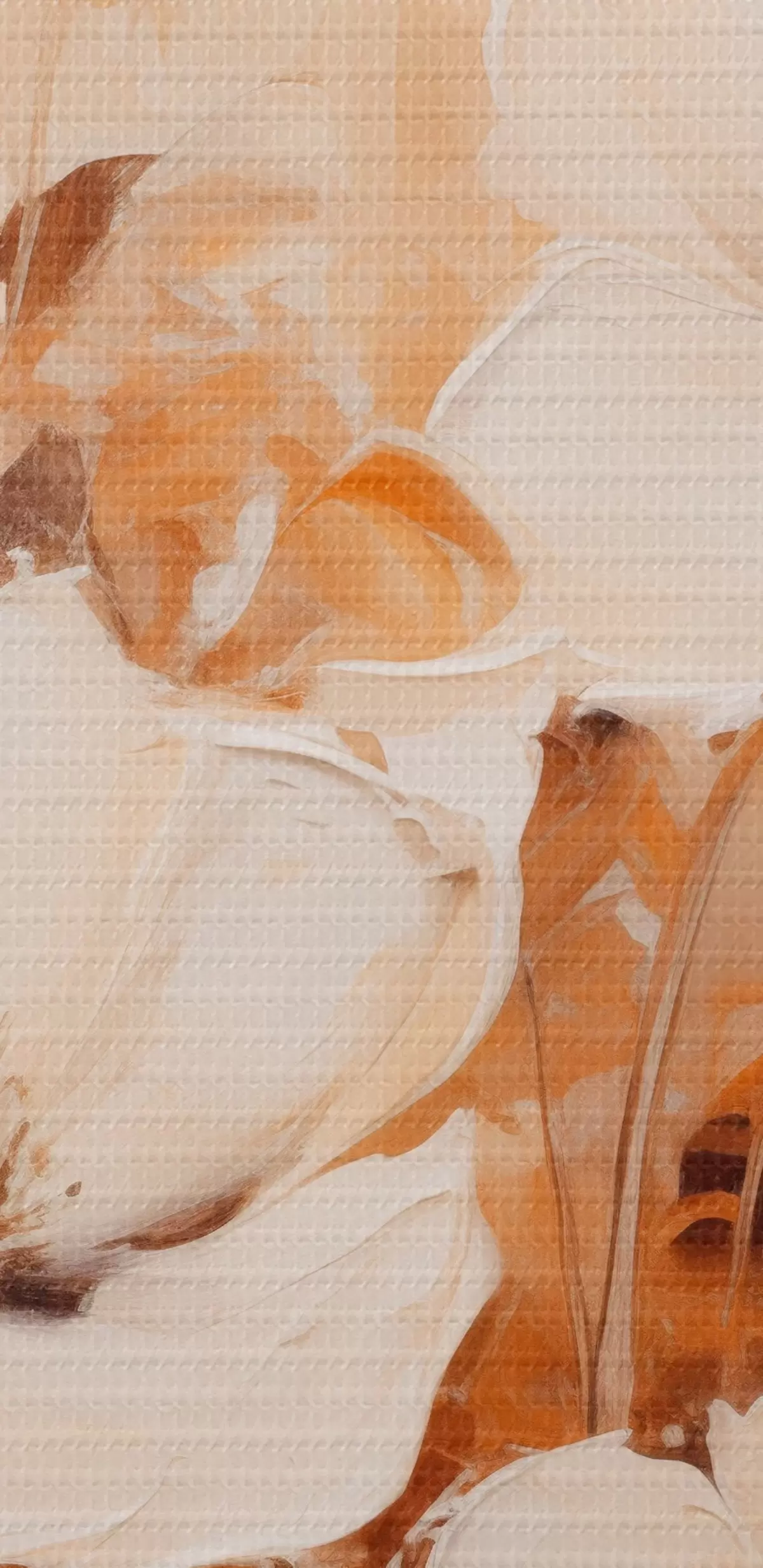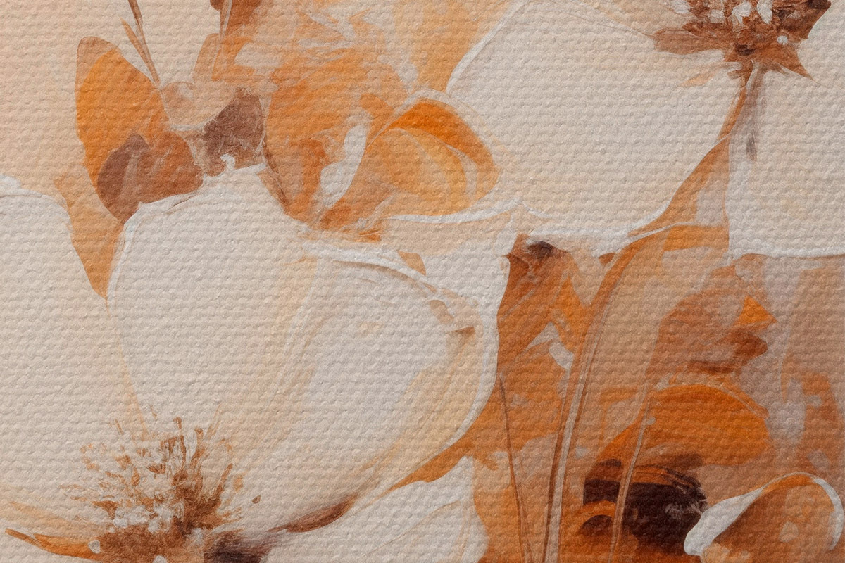 Ronde schilderijen Witte bloemen met oranje bladeren, fijne penseelstreken, warm kleurenpalet, elegante compositie r45573