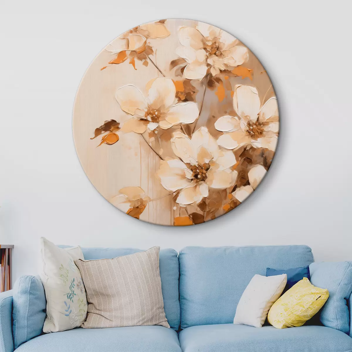 Ronde schilderijen Witte bloemen met oranje bladeren, fijne penseelstreken, bloemstuk, botanische kunst Nr r45574