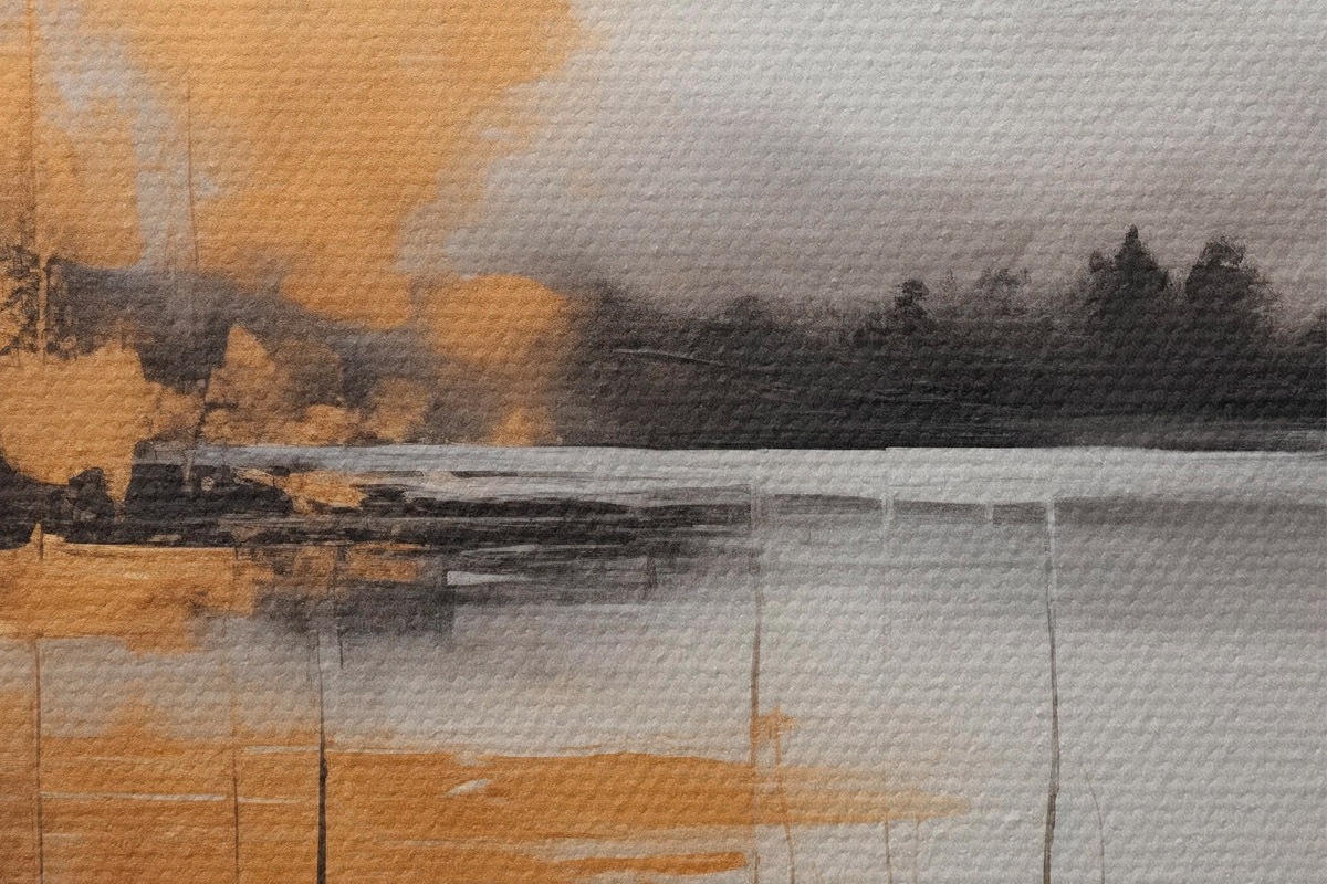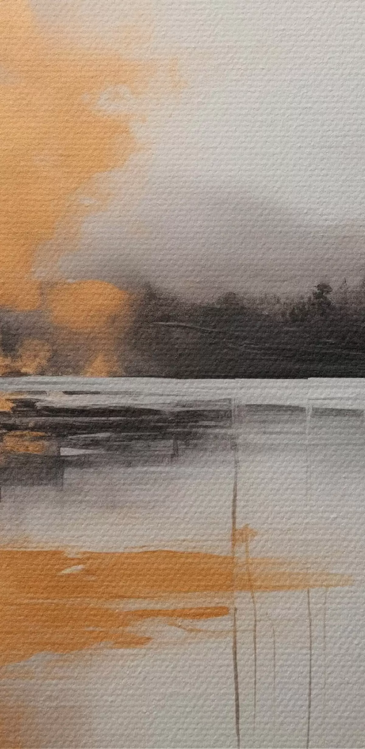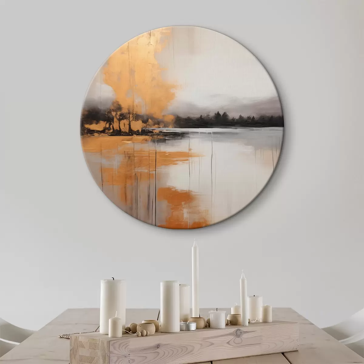 Ronde schilderijen Een abstract landschap met een meer, boom en gele mist, het water weerspiegelt en bewolkte lucht Nr r45575