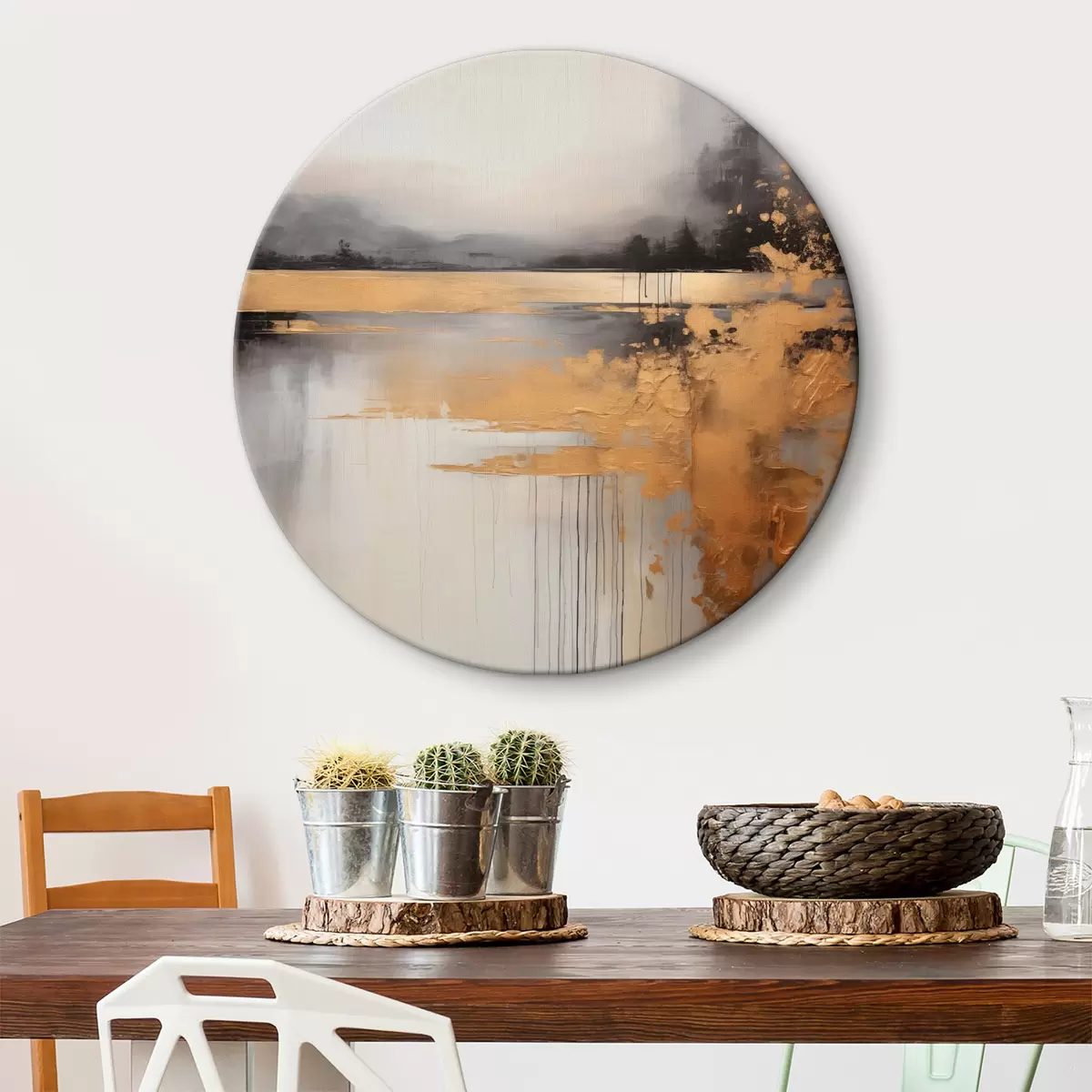 Ronde schilderijen Abstract textuurlandschap met een rivier en donkere bomen op de achtergrond, de lucht is bewolkt Nr r45576