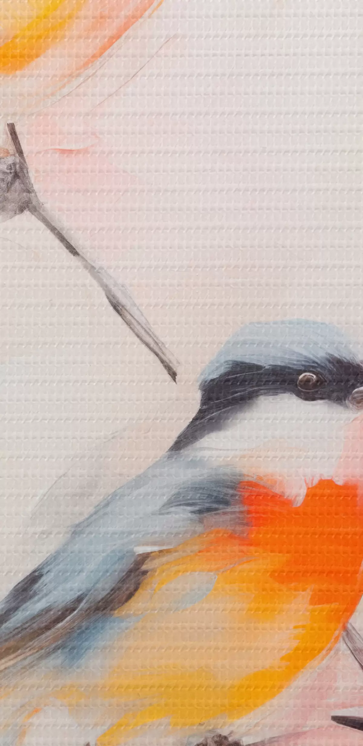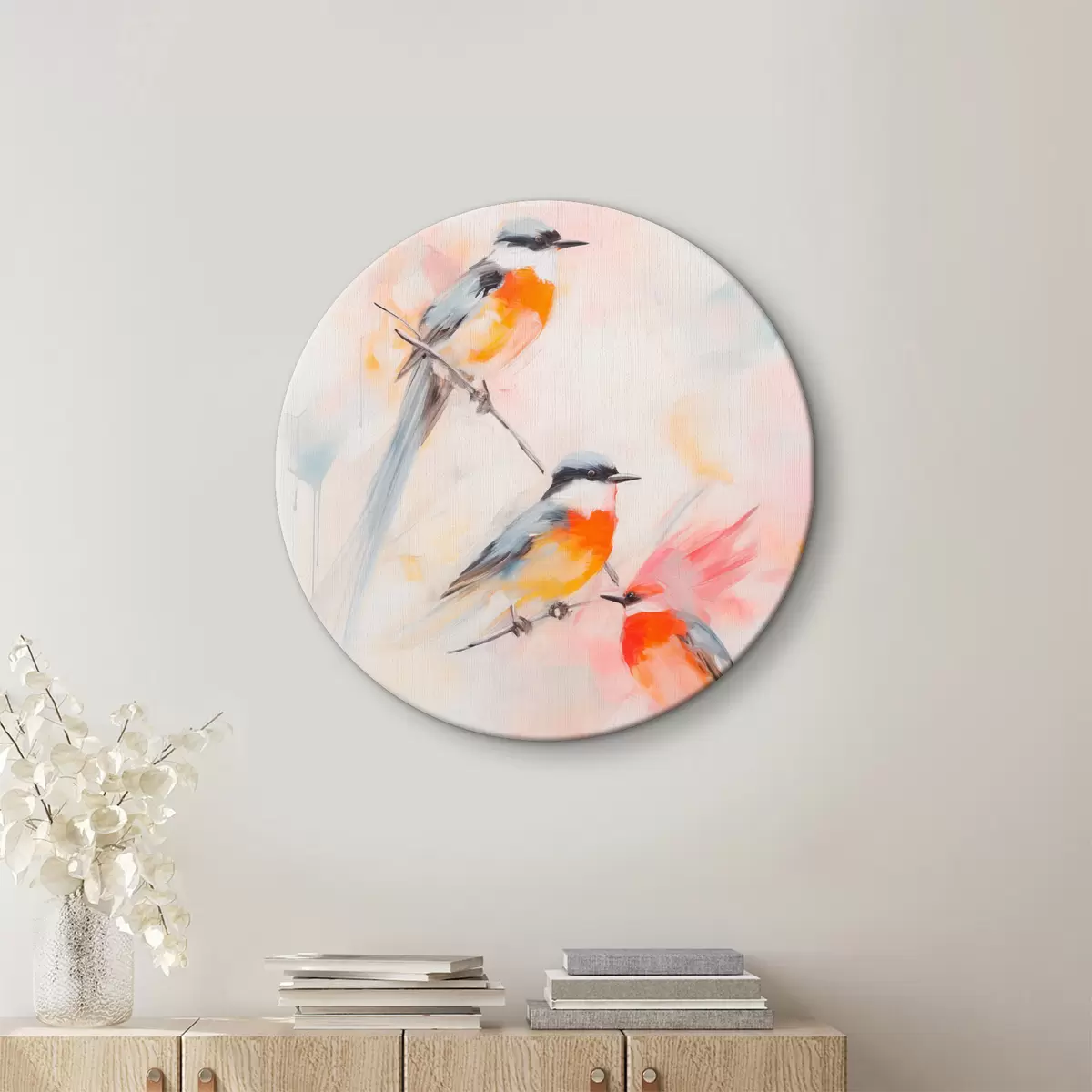 Ronde schilderijen Vogels neergestreken op takken , zachte pastelkleuren, lichte achtergrond met roze en witte tinten Nr r45577