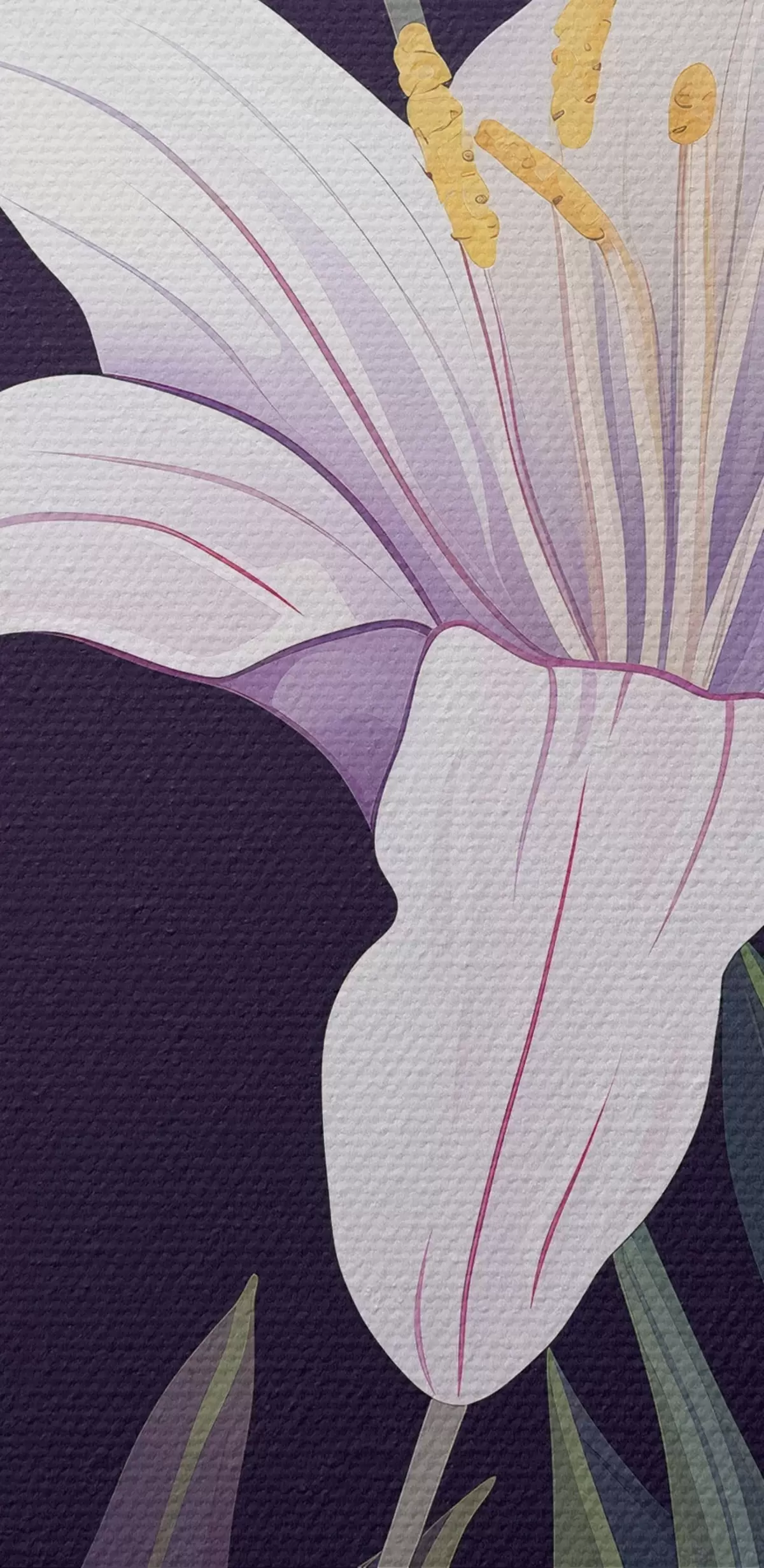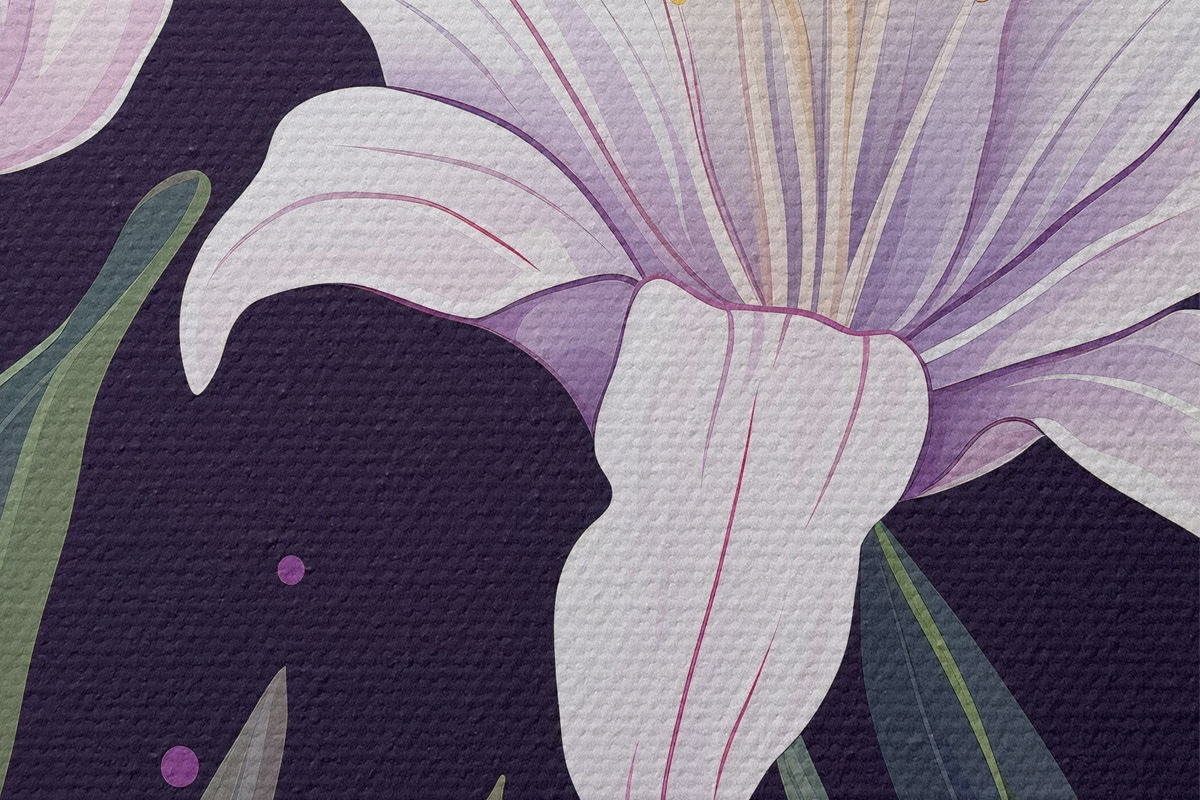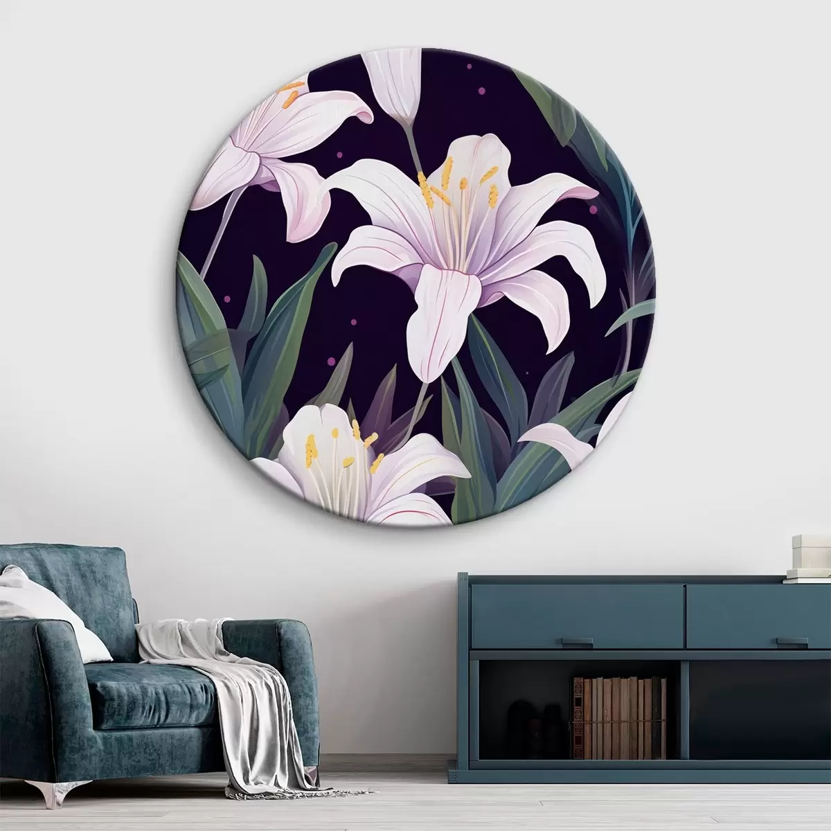 Ronde schilderijen Delicate lelies op een donkere achtergrond met groene bladeren Nr r45697