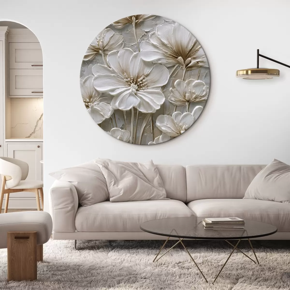 Ronde schilderijen crèmekleurige bloemen in imitatie-impastostijl r45712