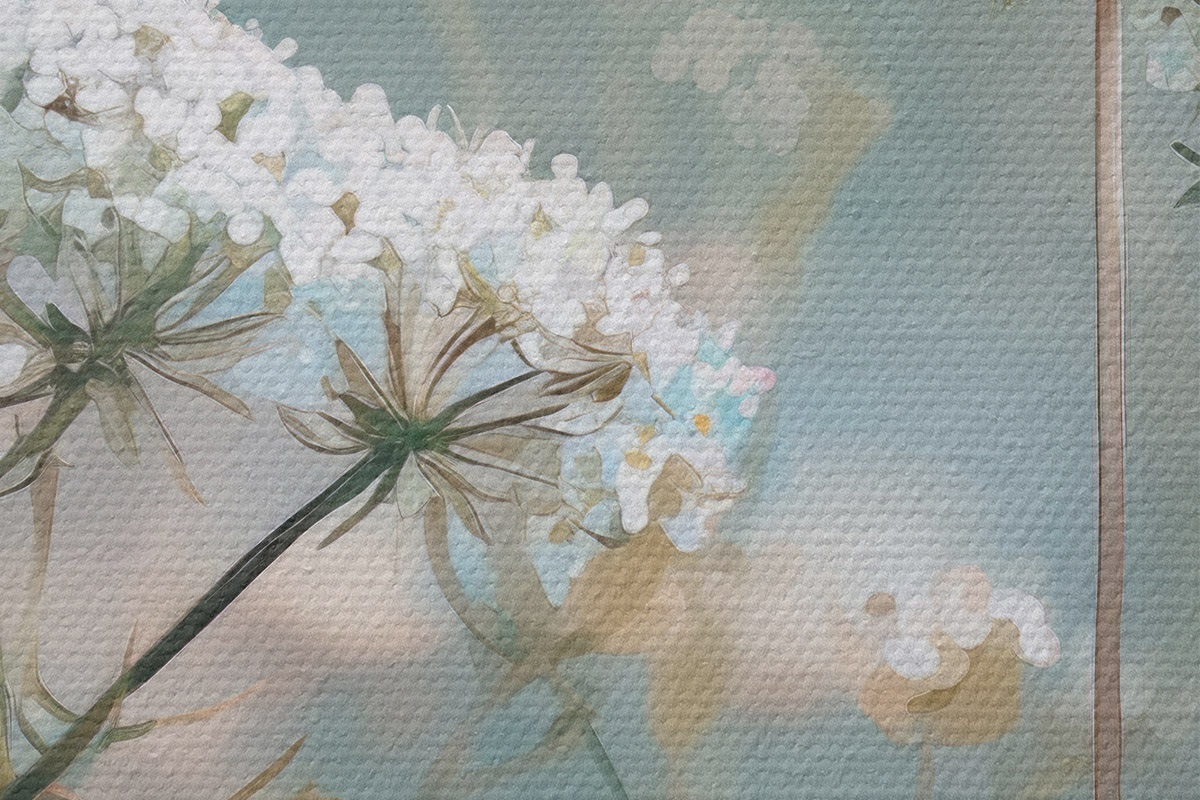Ronde schilderijen Queen Anne's Lace-bloemen in aquarelstijl op een blauwe achtergrond Nr r45721