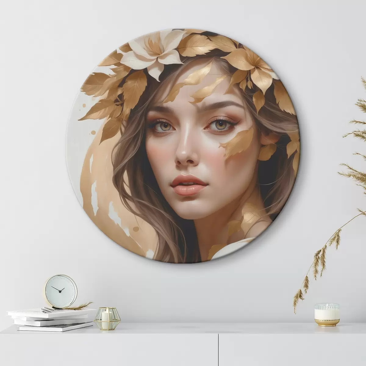 Ronde schilderijen Een vrouw met bladeren in haar haar Nr r45748