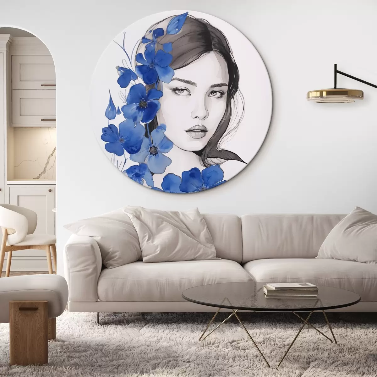 Ronde schilderijen Meisje en blauwe bloemen Nr r45757