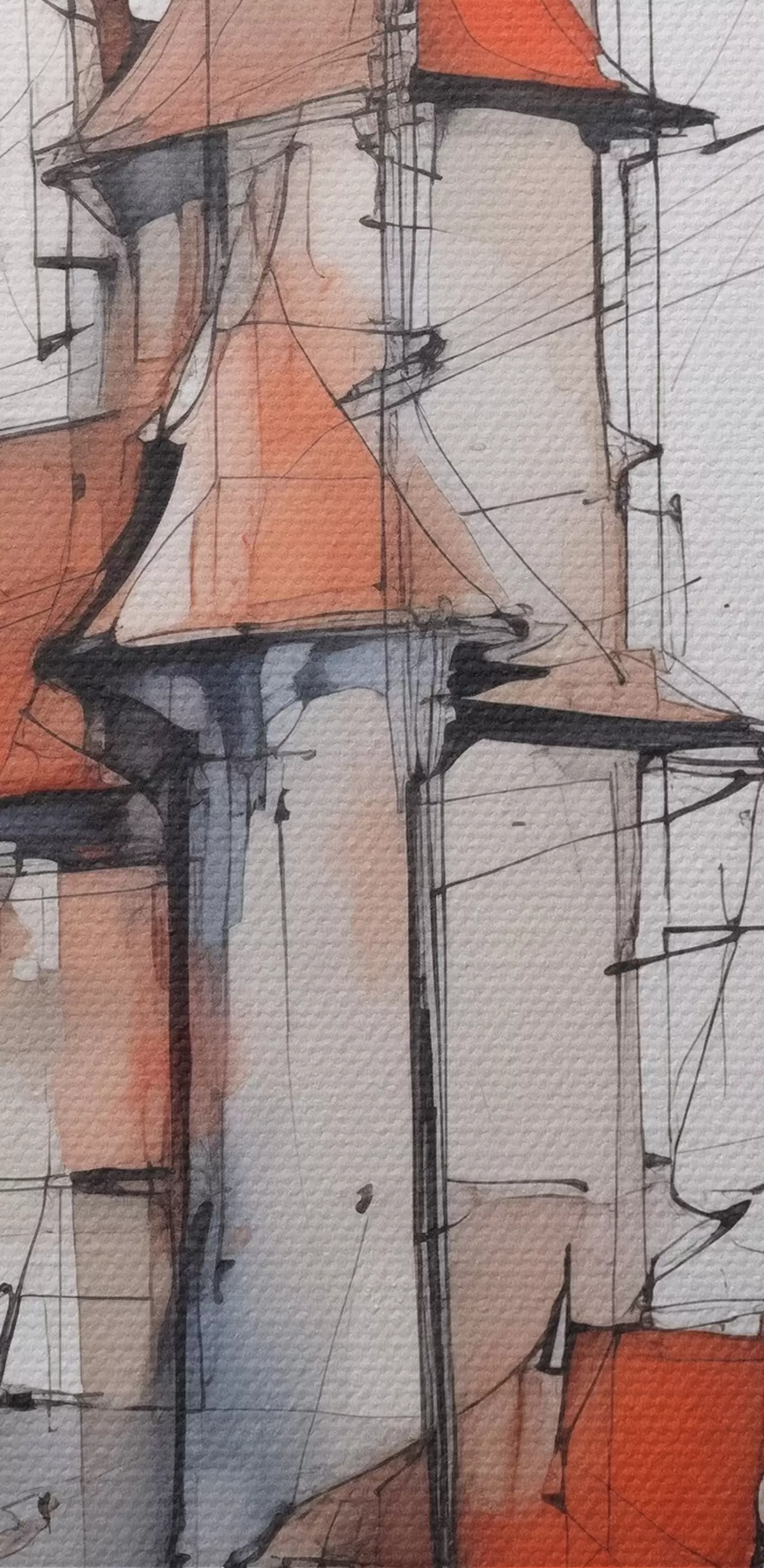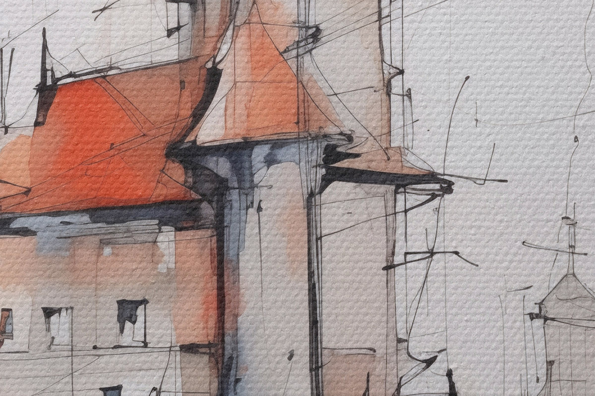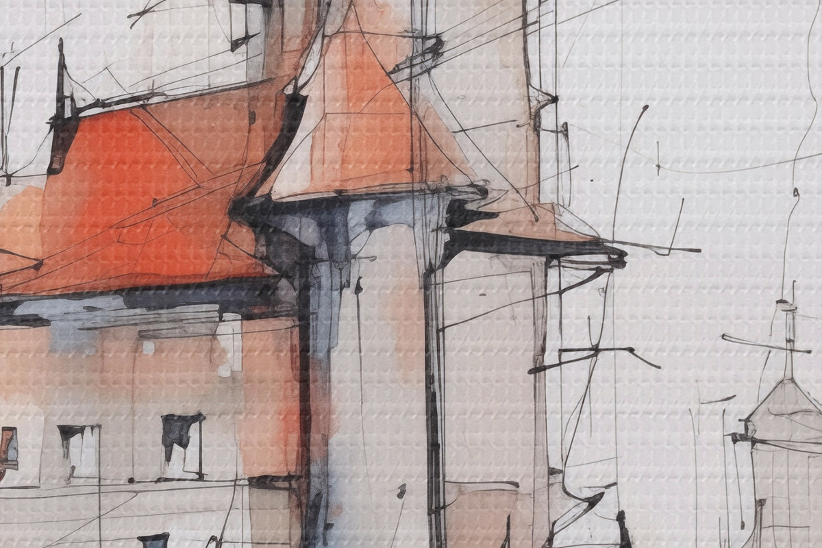 Ronde schilderijen Huizen imitatie schets en aquarel r45764