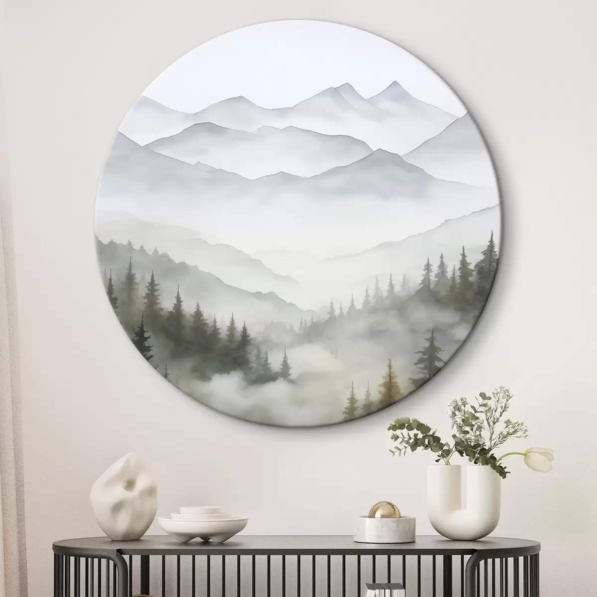 Ronde schilderijen Bos in de mist voor de bergen Nr r45774
