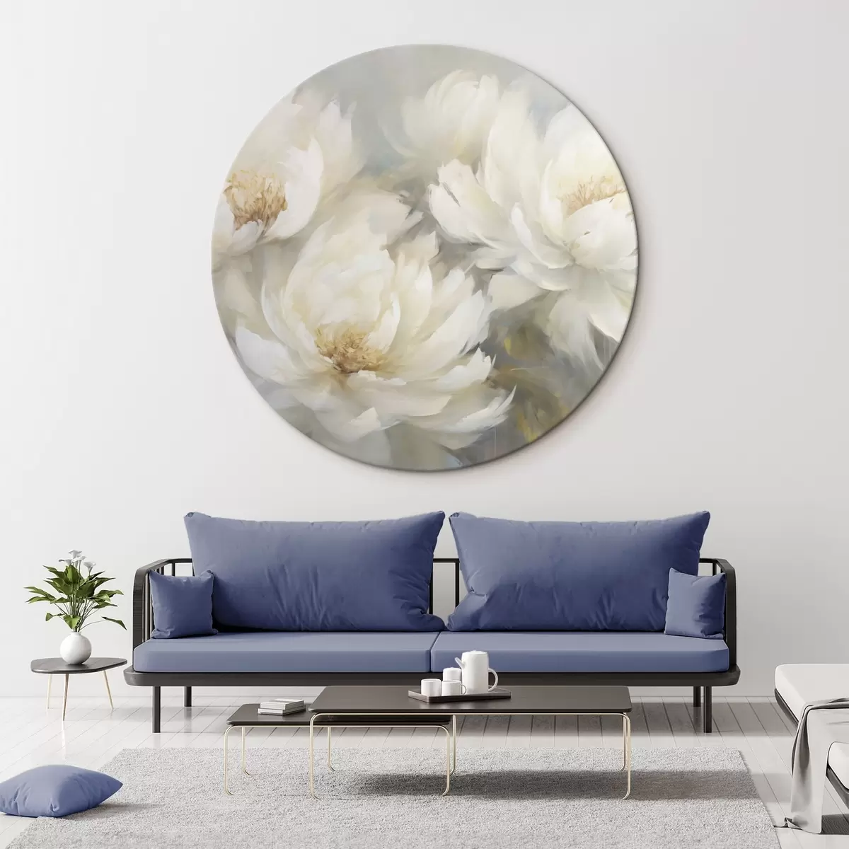 Ronde schilderijen Drie weelderige witte pioenrozen op een delicate achtergrond Nr r45808
