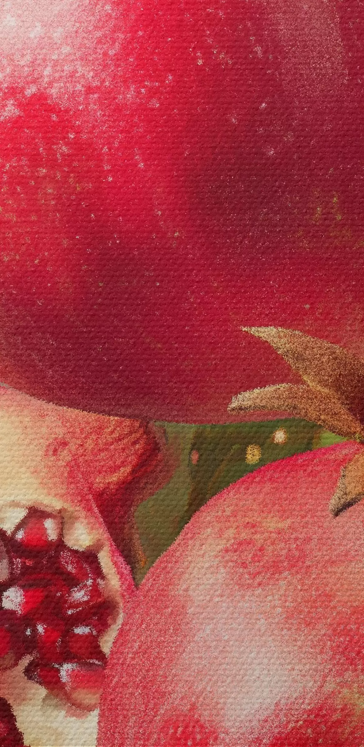 Ronde schilderijen Rijpe granaatappels op een roze achtergrond met bladeren en vlekjes Nr r45868
