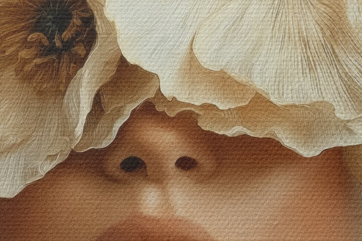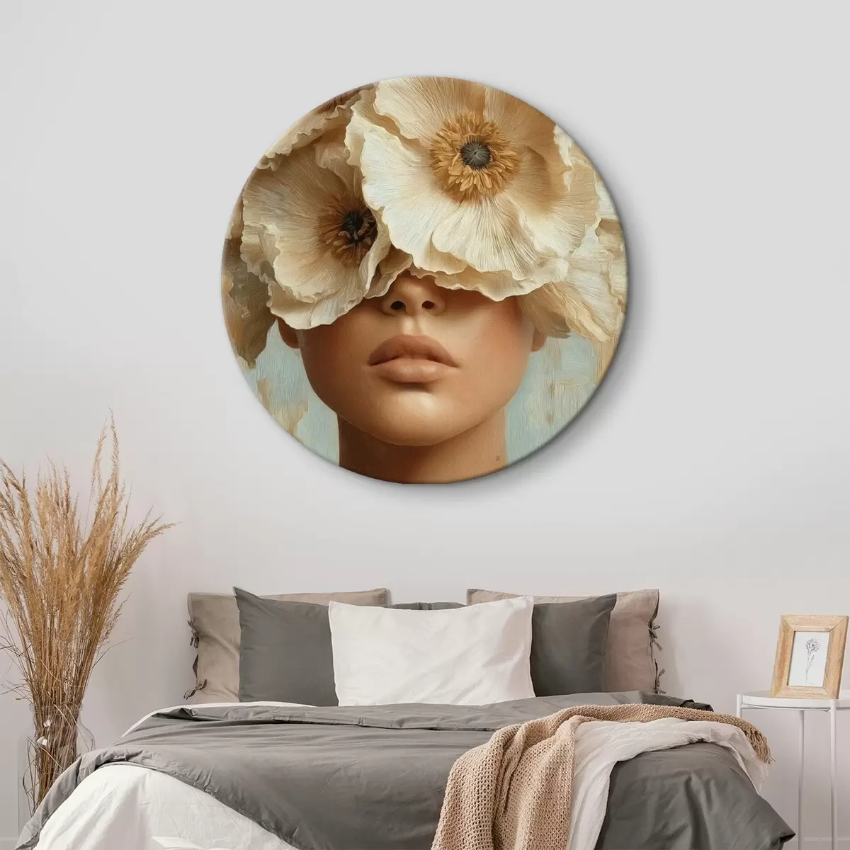 Ronde schilderijen Portret met beige bloemen die de ogen bedekken Nr r45870