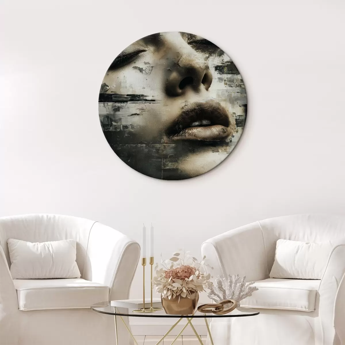 Ronde schilderijen Abstract vrouwelijk portret met glitch-effect en texturen Nr r45873