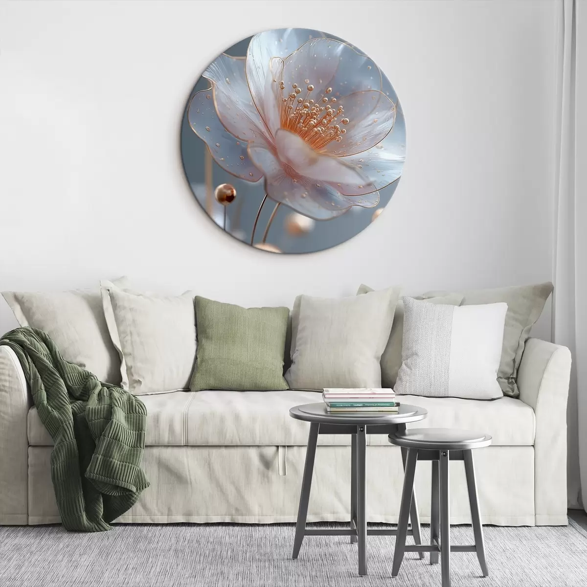 Ronde schilderijen Doorschijnende bloem met koperen meeldraden op blauw Nr r45880