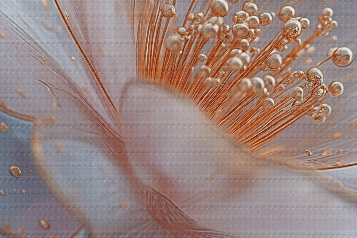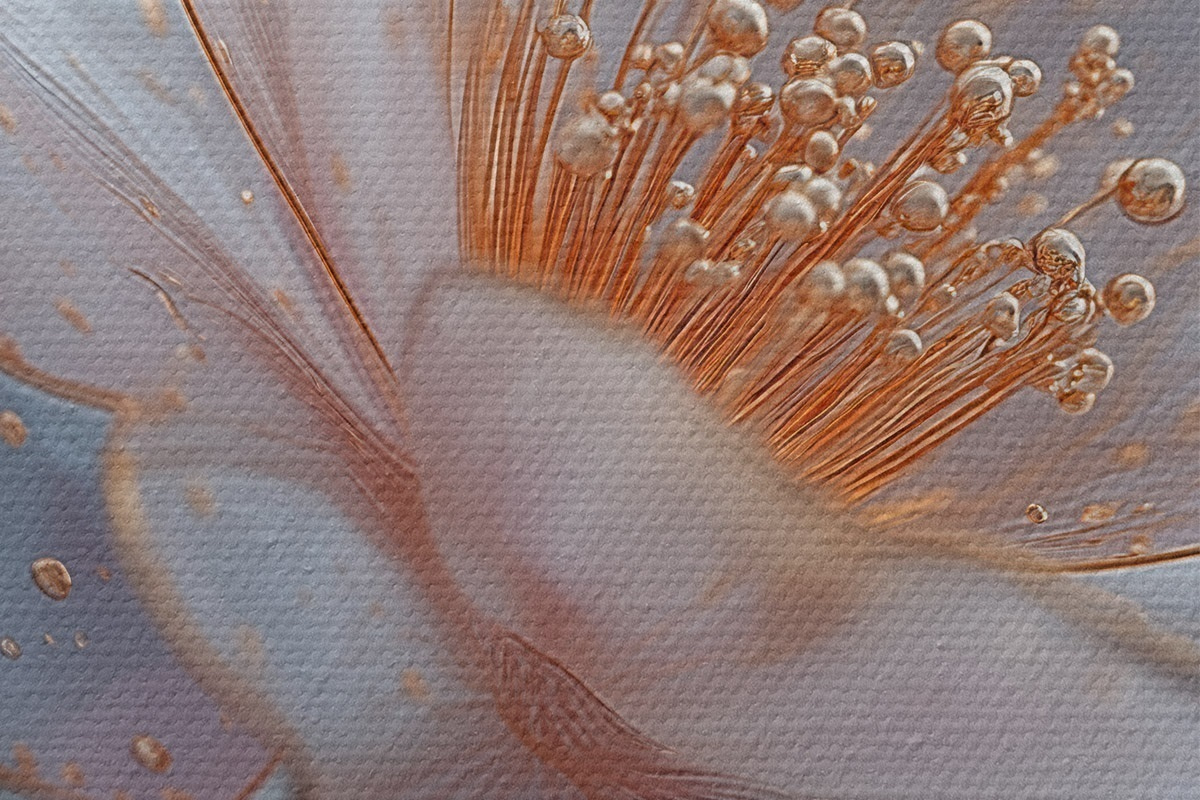 Ronde schilderijen Doorschijnende bloem met koperen meeldraden op blauw r45880
