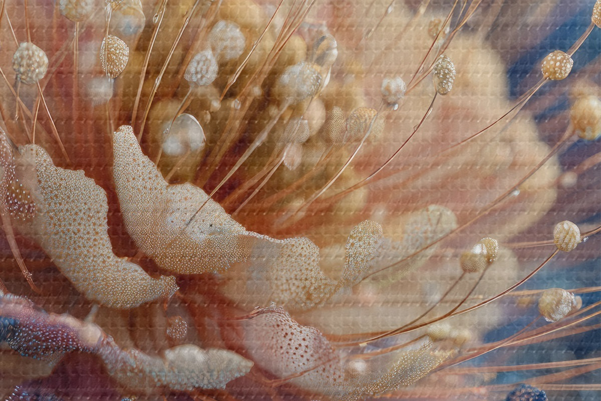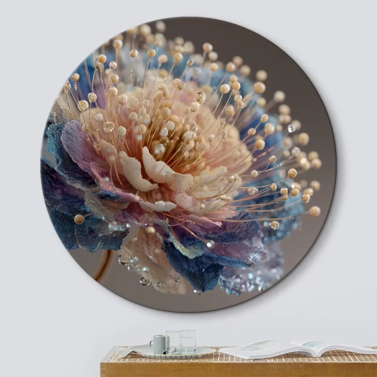 Ronde schilderijen Parelmoerachtige bloem met dauwdruppels, perzikkleurige en blauwe bloemblaadjes Nr r45911