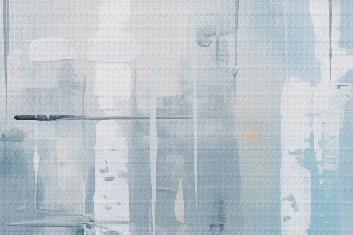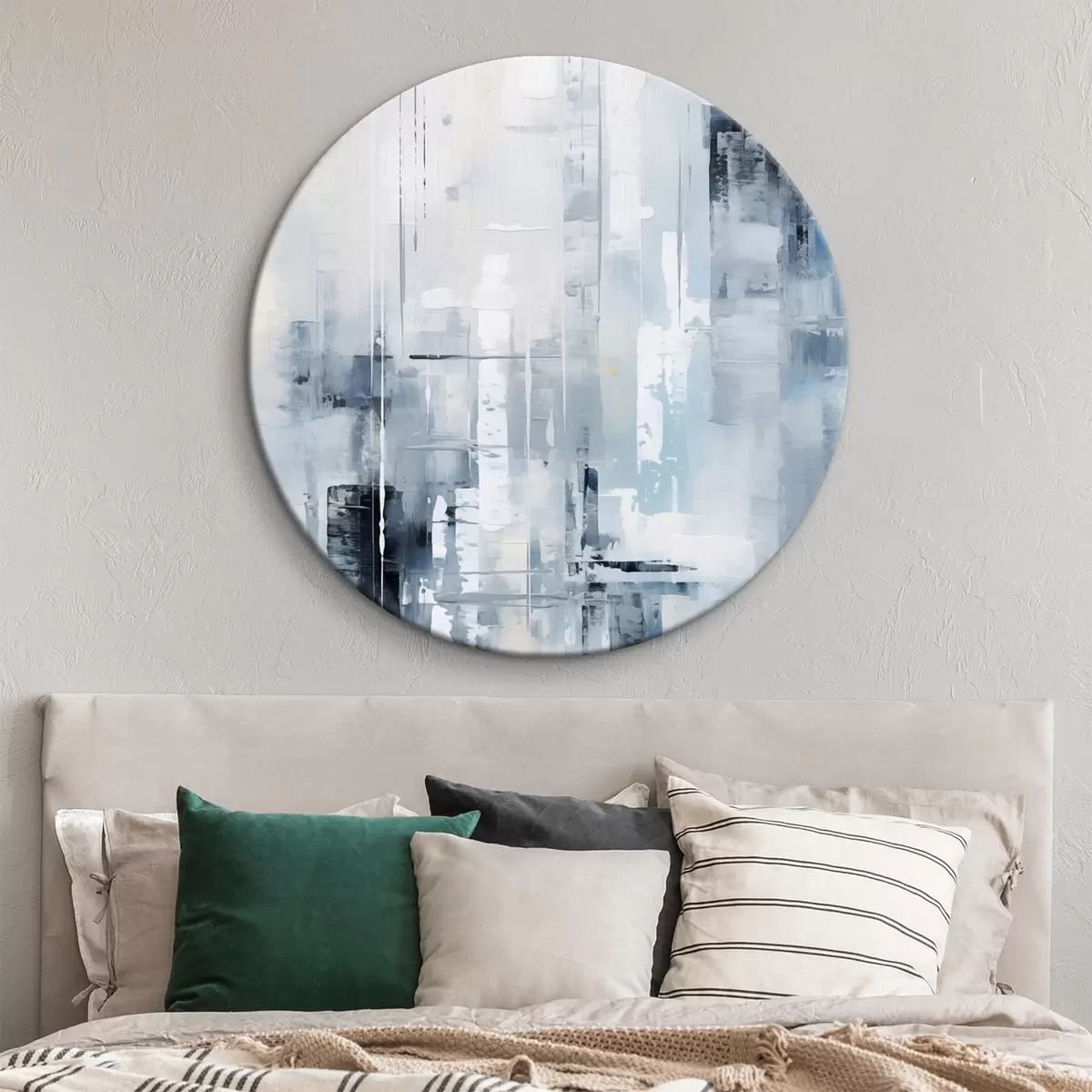 Ronde schilderijen Abstracte schilderijimitatie met blauwe, grijze en witte kleuren, verticale lijnen en geometrische vormen Nr r45927