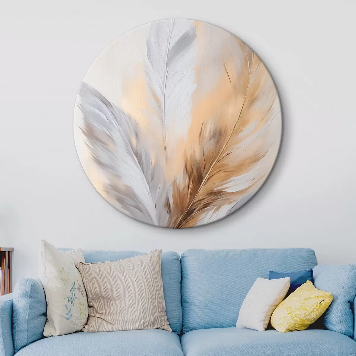 Ronde schilderijen Veren met oranje accenten, minimalistische compositie met textuur, moderne kunst r45945