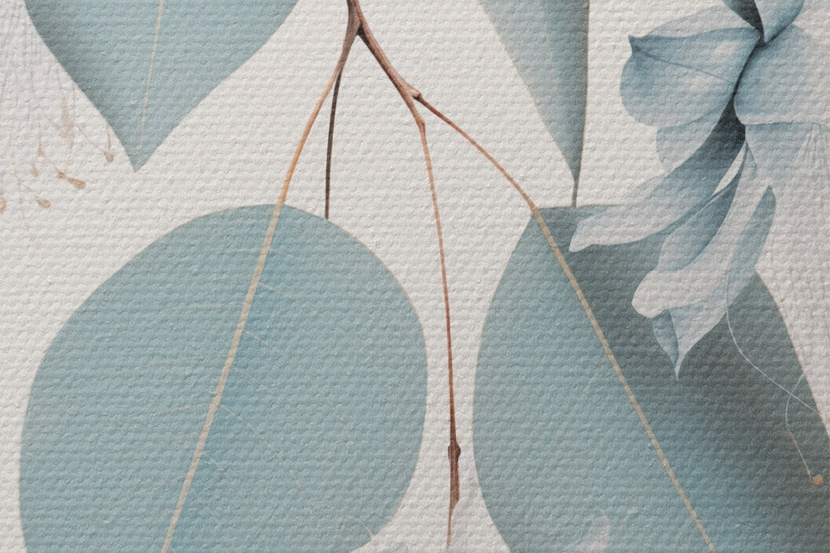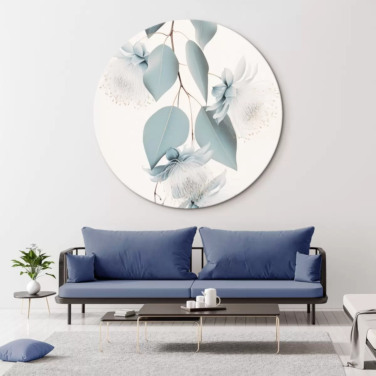 Ronde schilderijen Eucalyptustak met blauwe bladeren en witte bloemen, lichte achtergrond Nr r45947
