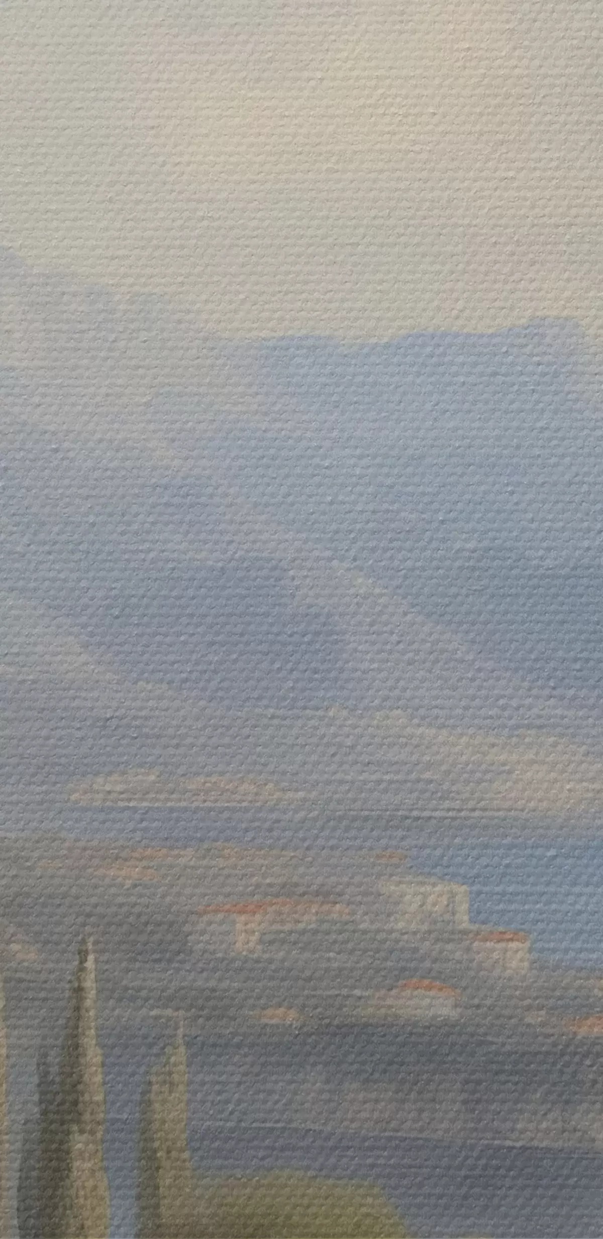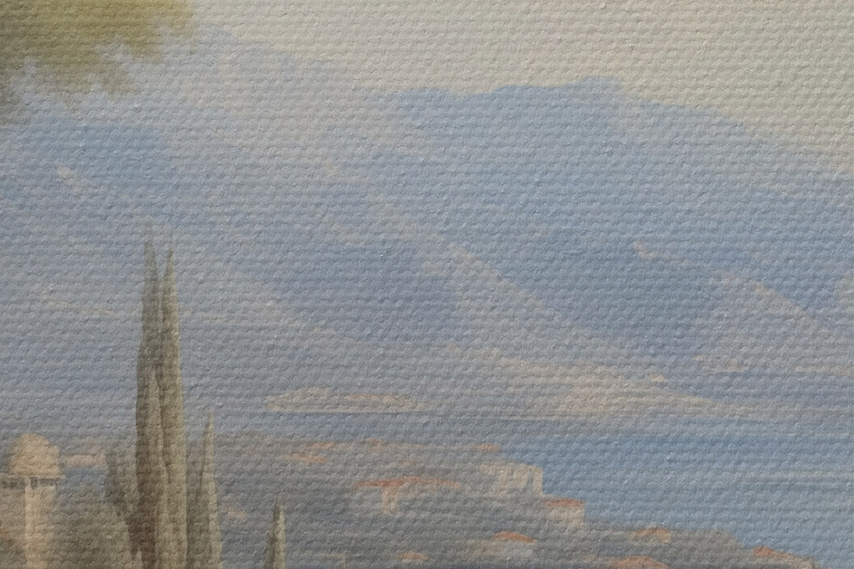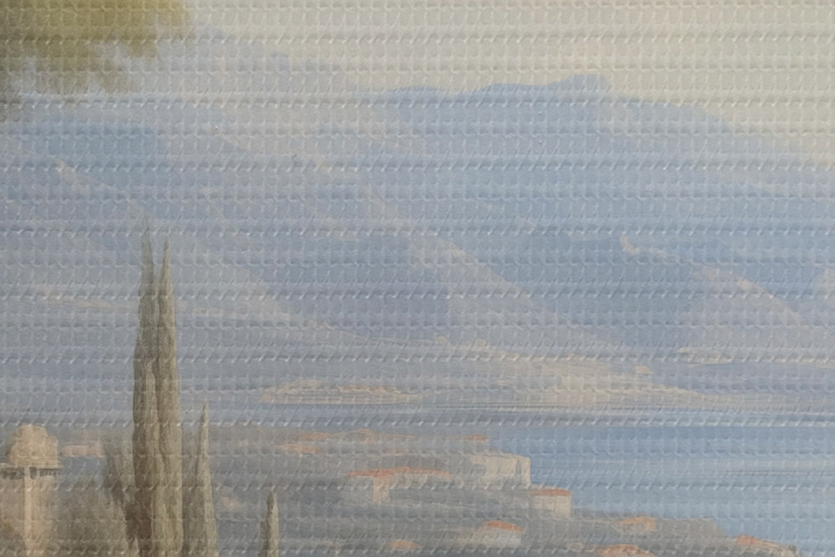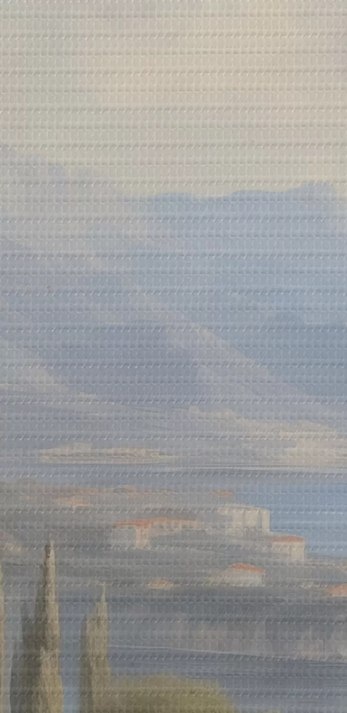 Het schilderij kan voorzichtig worden schoongeveegd met een droge zachte doek of spons; het wordt niet aanbevolen om natte producten te gebruiken. Het gebruik van een vochtige spons is alleen toegestaan als het schilderij gevernist is.