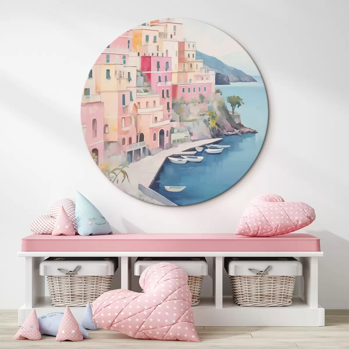 Ronde schilderijen Huizen aan de zeebaai r46066