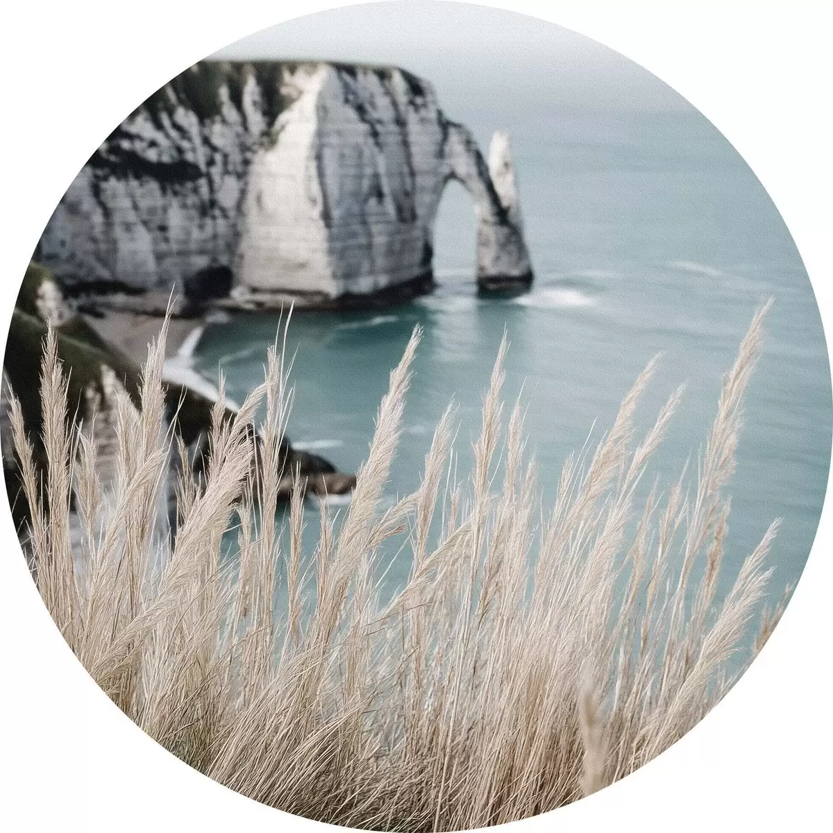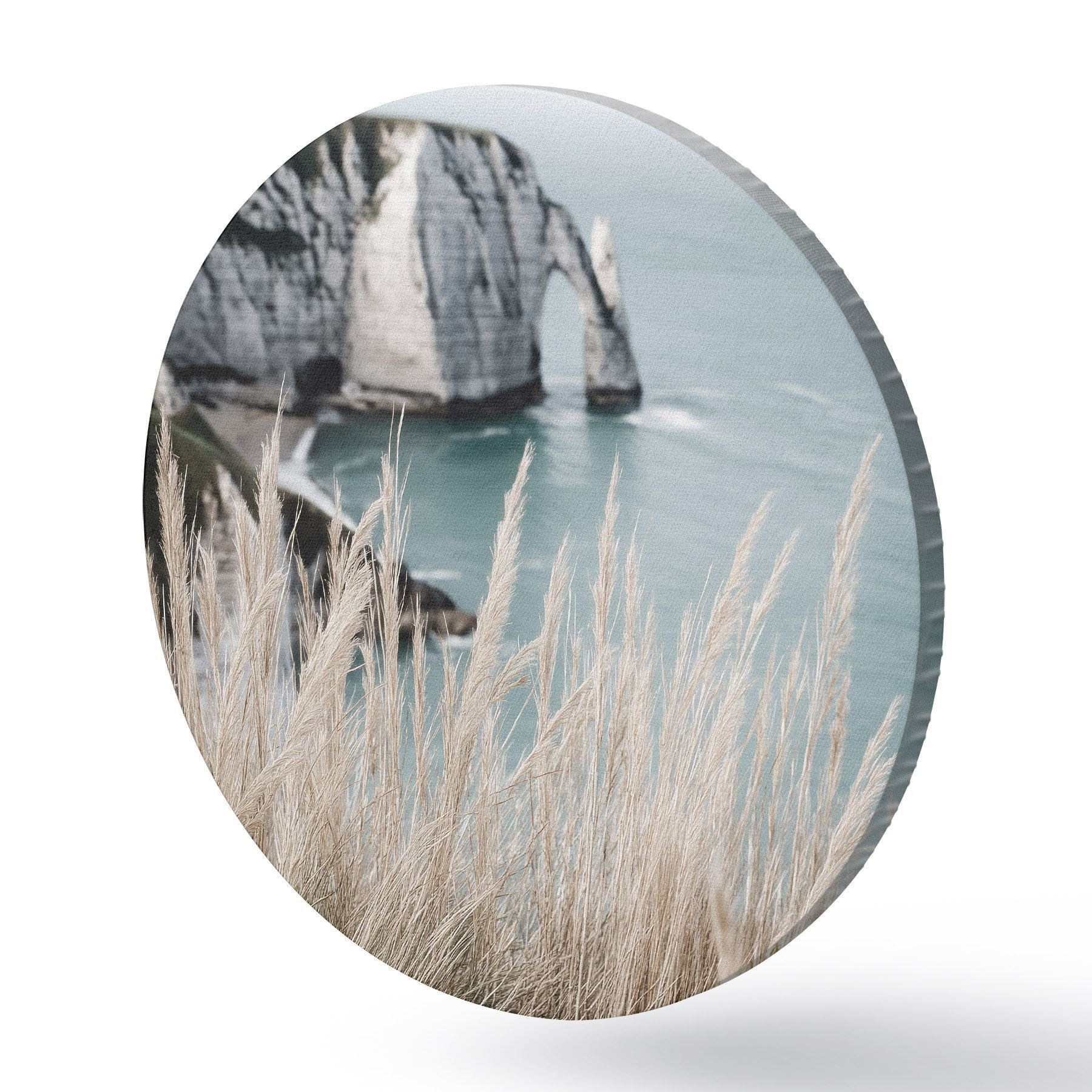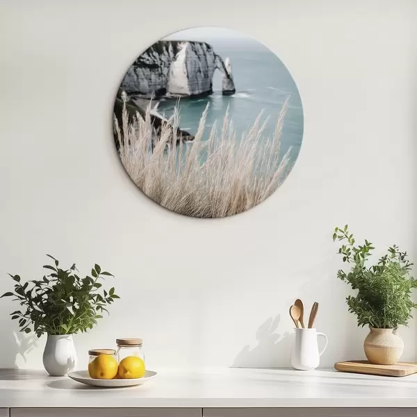 Ronde schilderijen Zee en rotsboog, uitzicht door droog gras Nr r46142