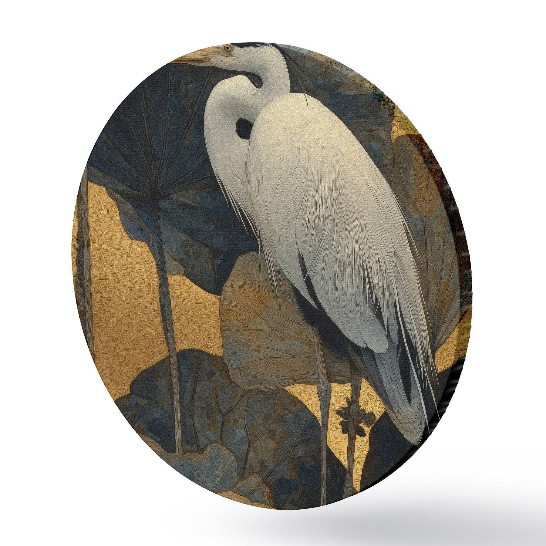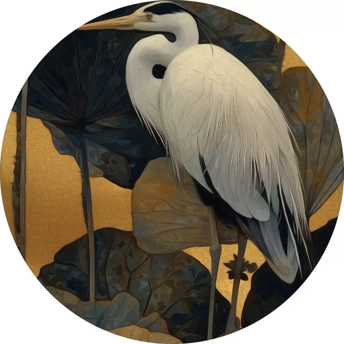 Ronde schilderijen Witte reiger tussen grote bladeren op een warme achtergrond Nr r46147
