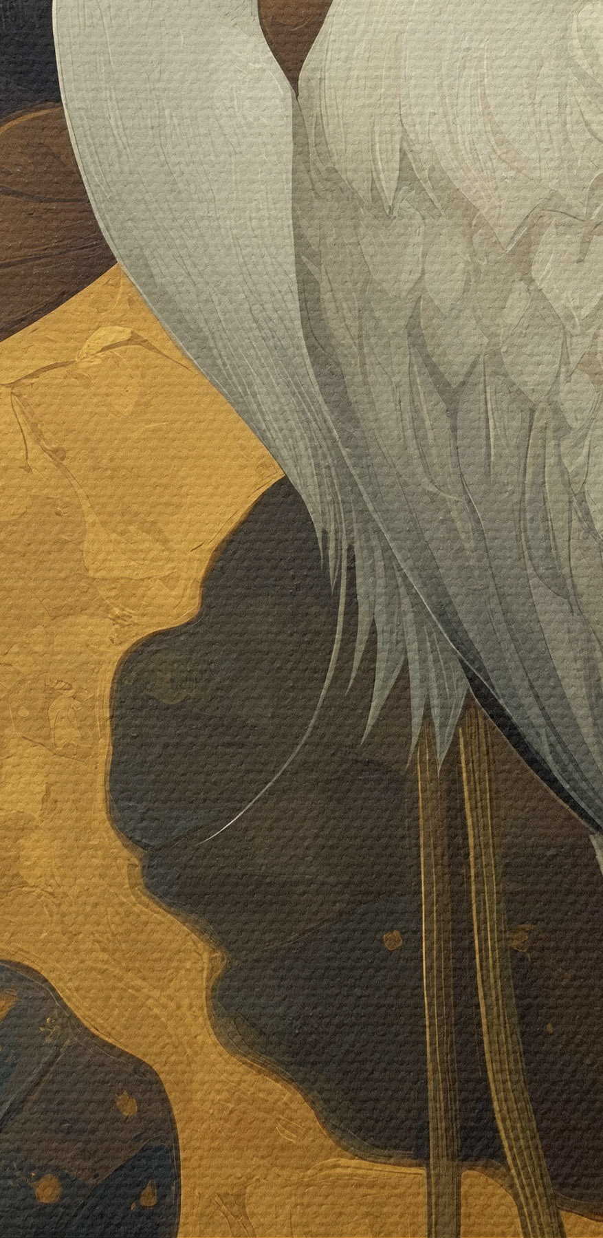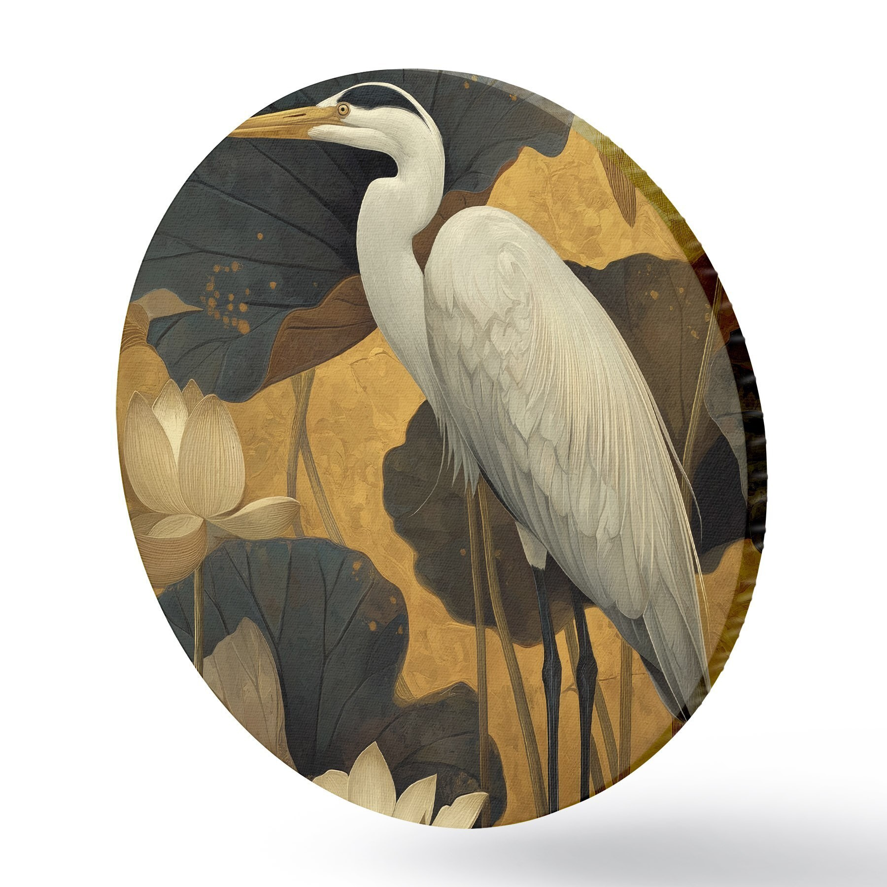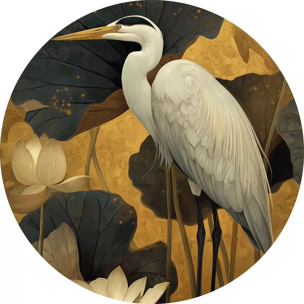 Ronde schilderijen Reiger tussen lotusbloemen op een warme achtergrond Nr r46148