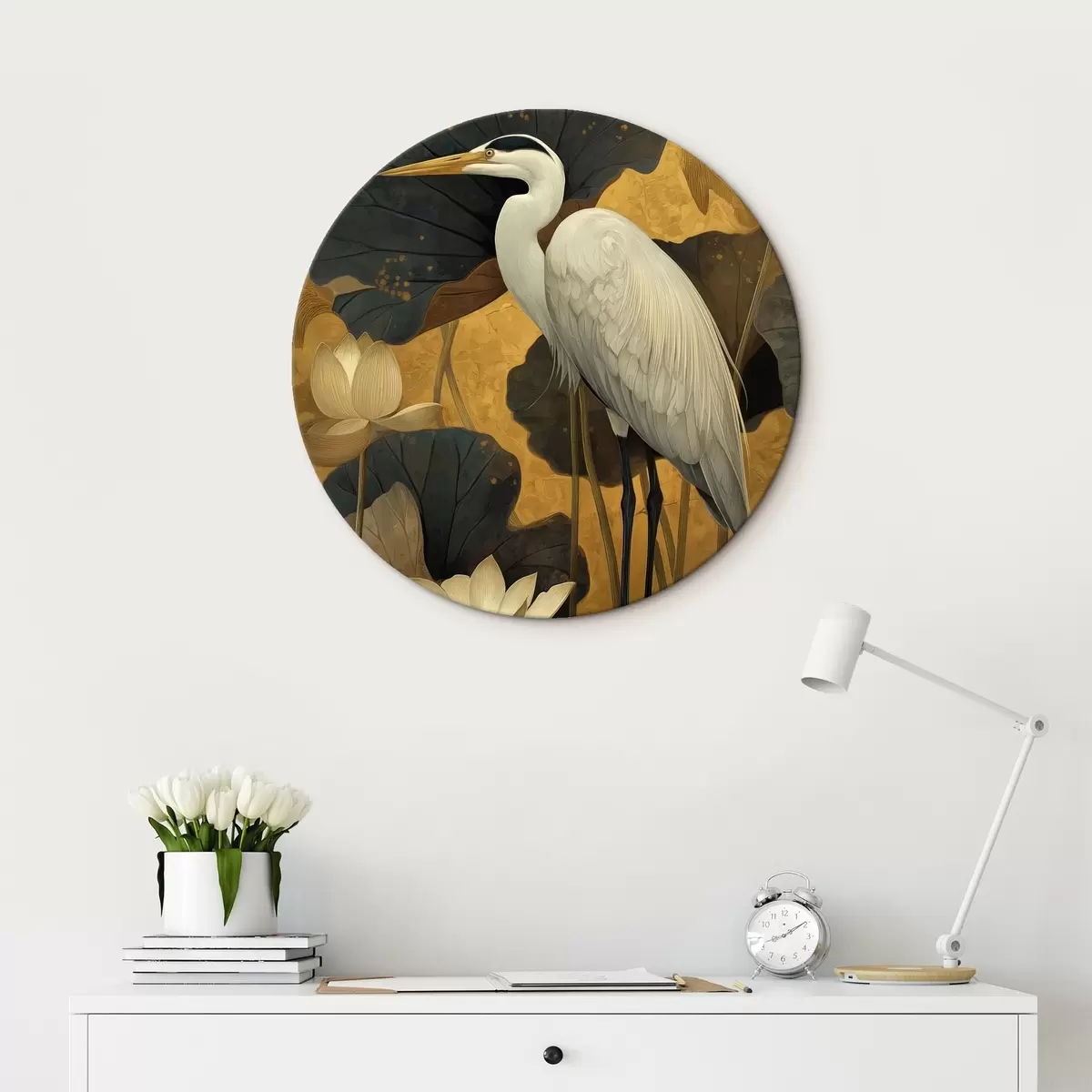 Ronde schilderijen Reiger tussen lotusbloemen op een warme achtergrond Nr r46148