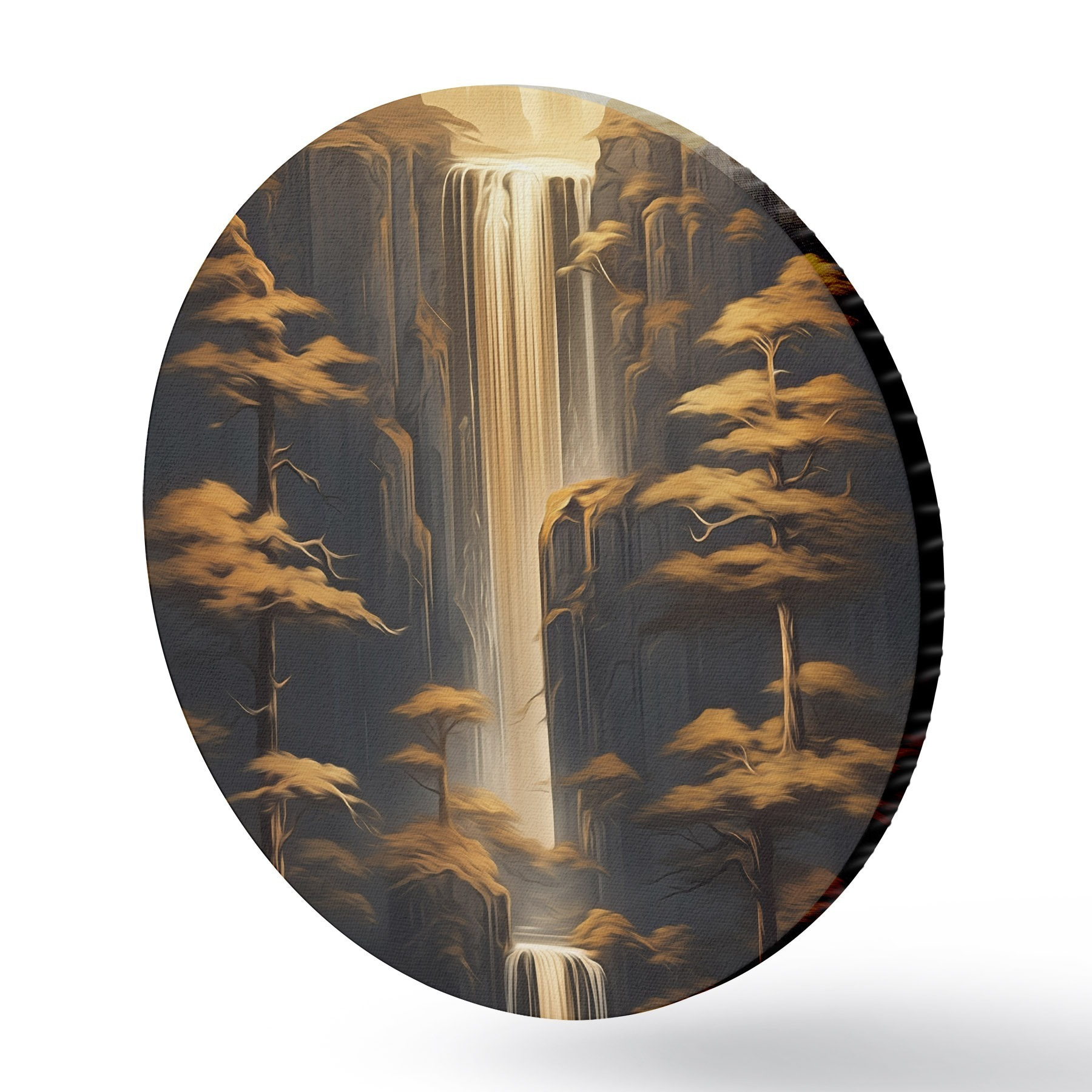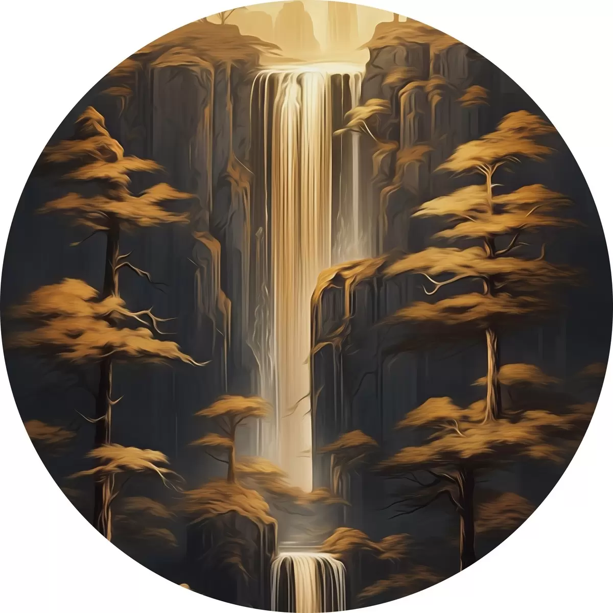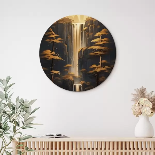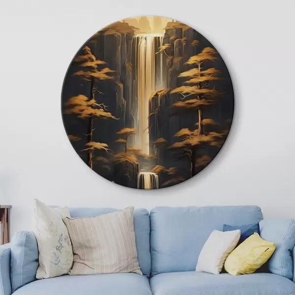 Ronde schilderijen Hoge kliffen met een waterval en dennenbomen in het avondlicht Nr r46151