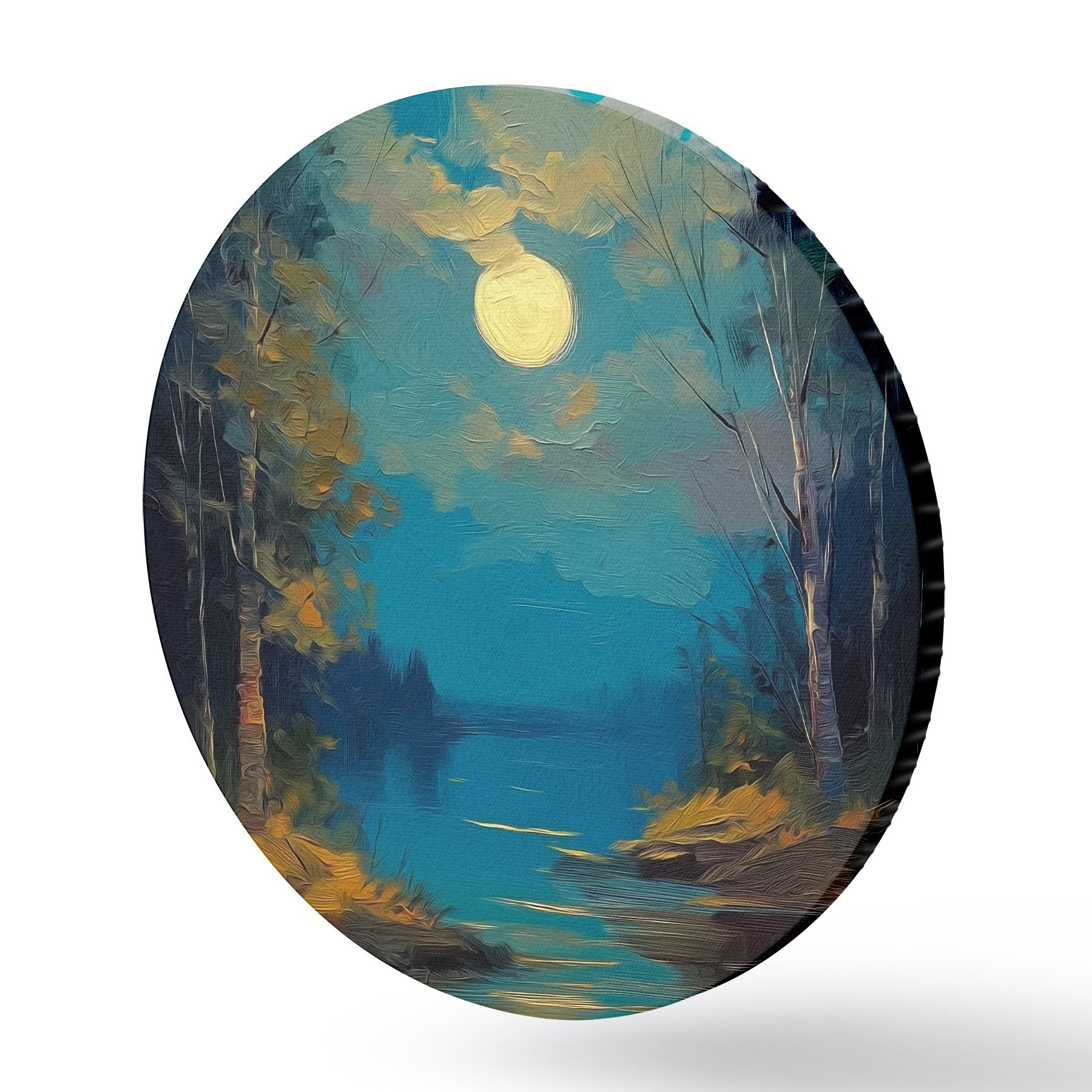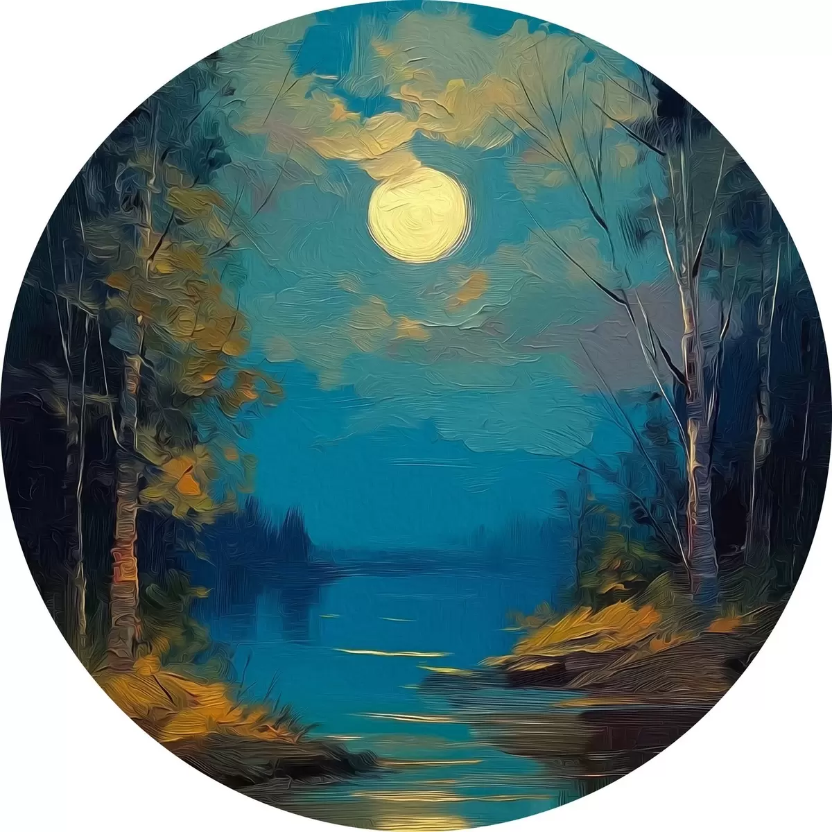 Ronde schilderijen Maanlicht boven een kalme rivier tussen dennenbomen Nr r46164