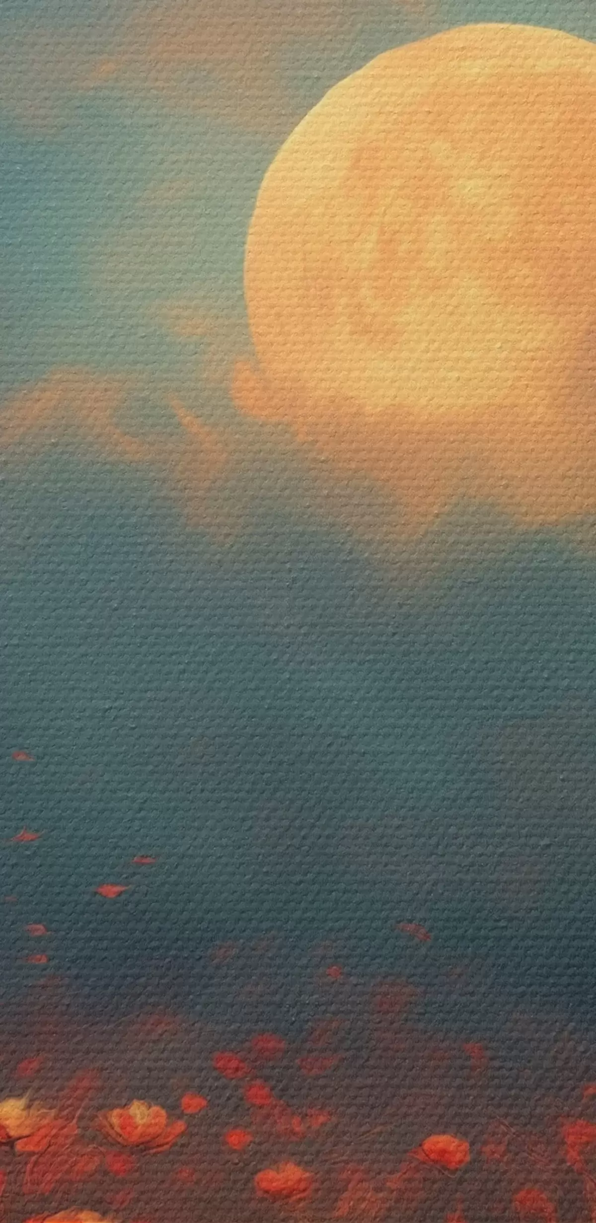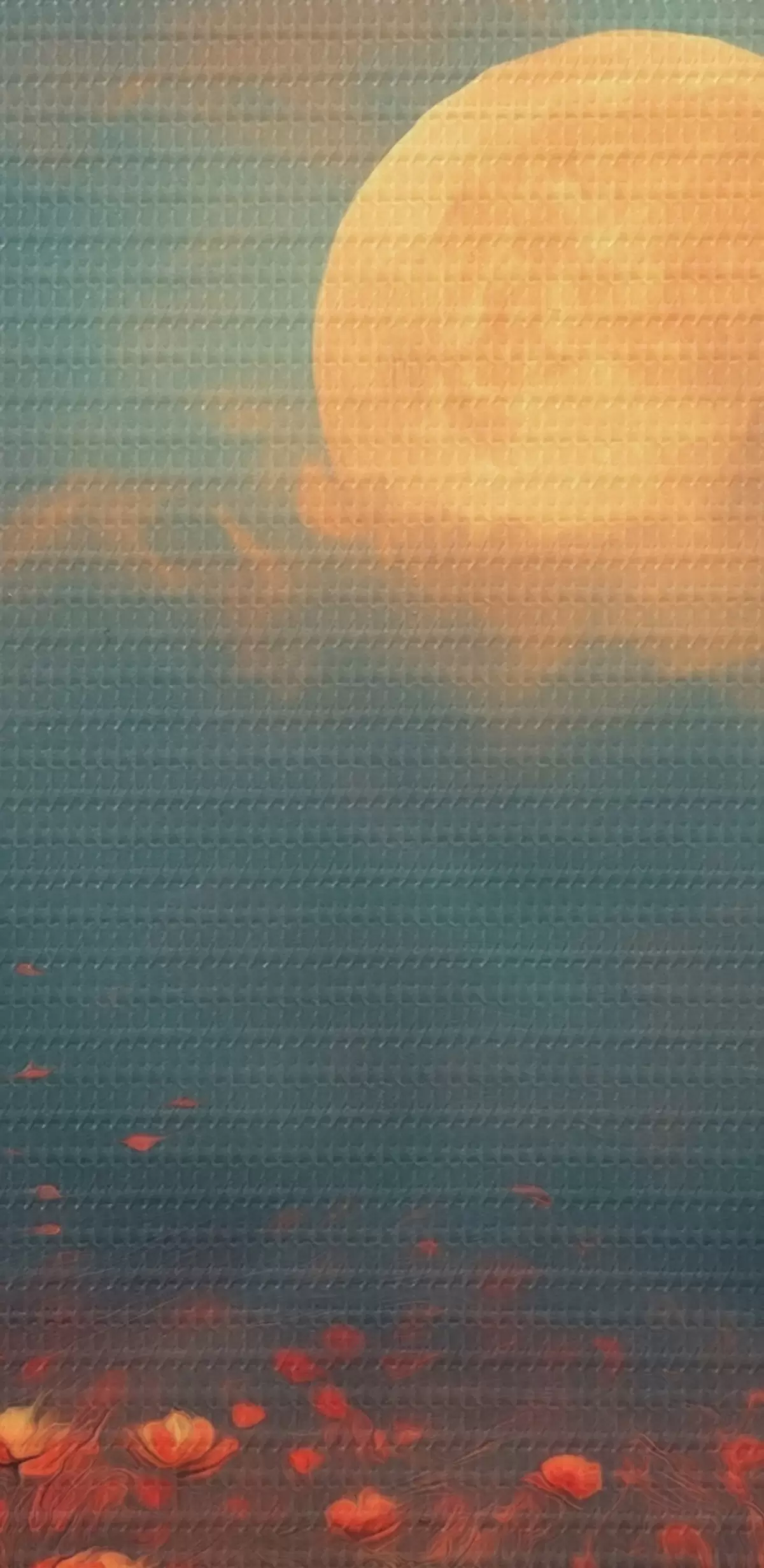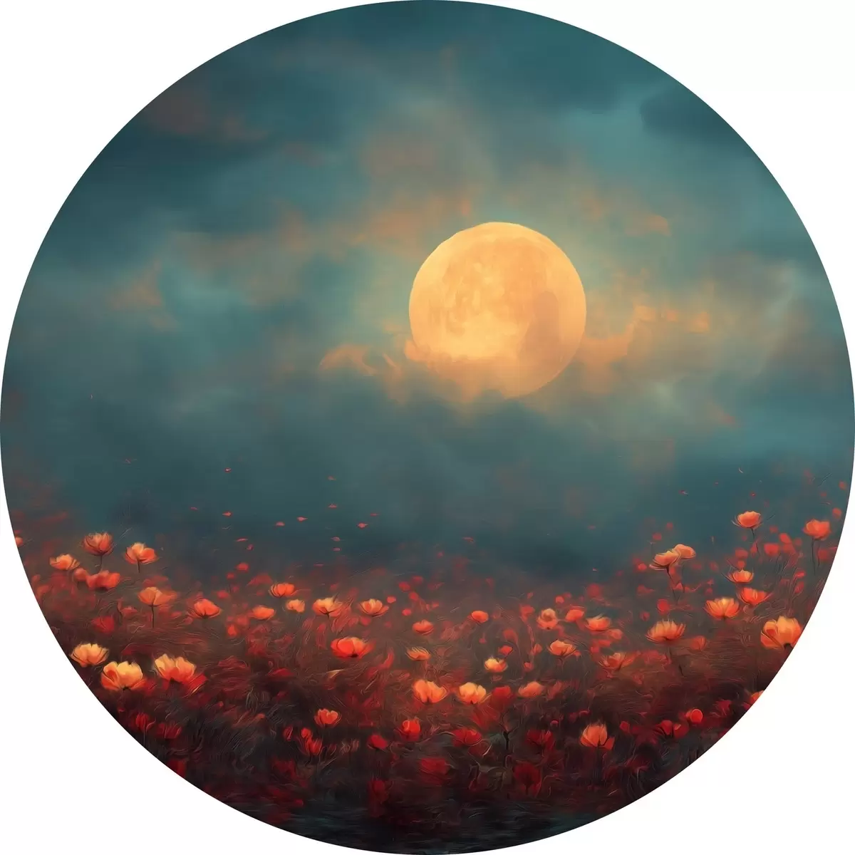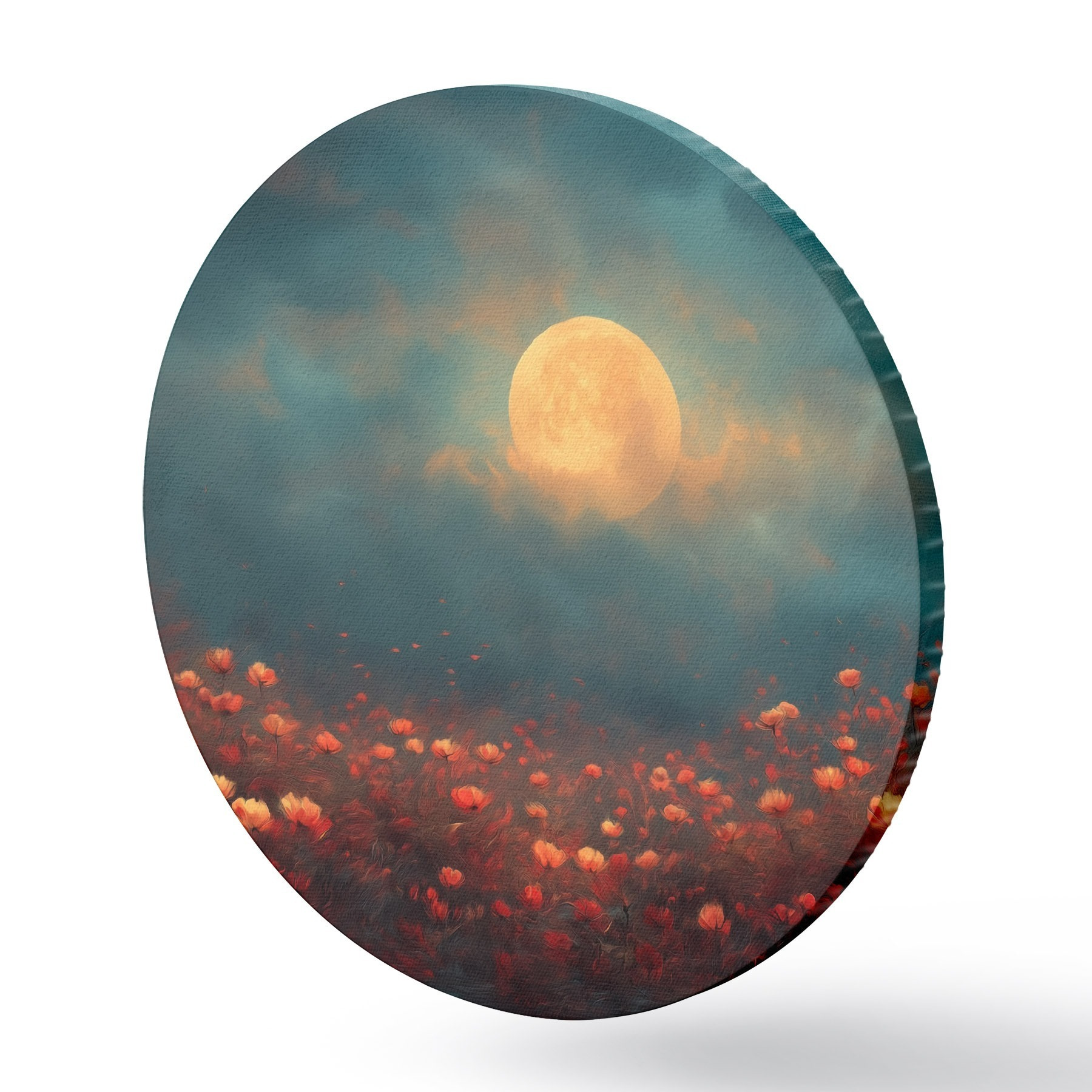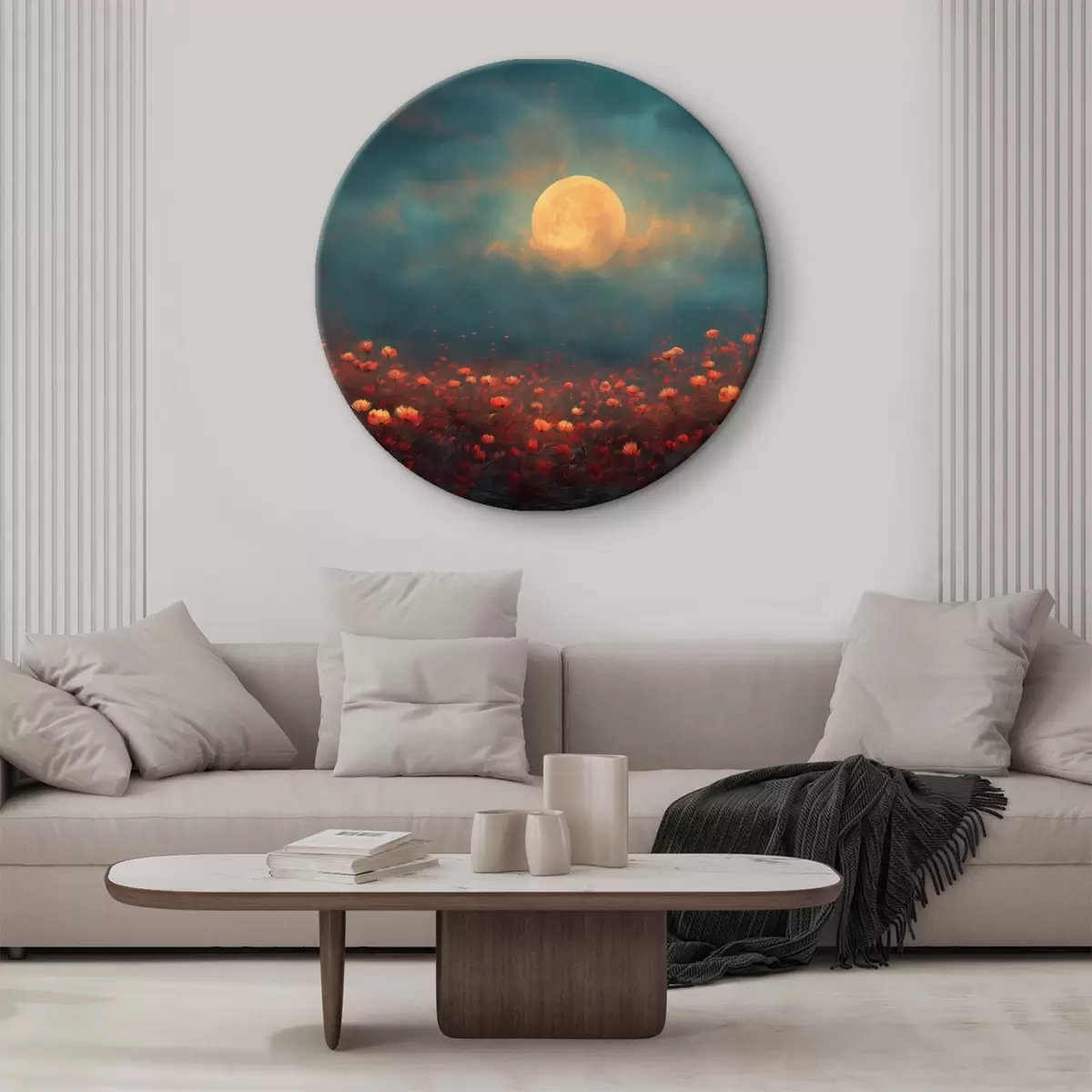 Ronde schilderijen Maan boven een veld met rode bloemen in een mistige avondhemel Nr r46167