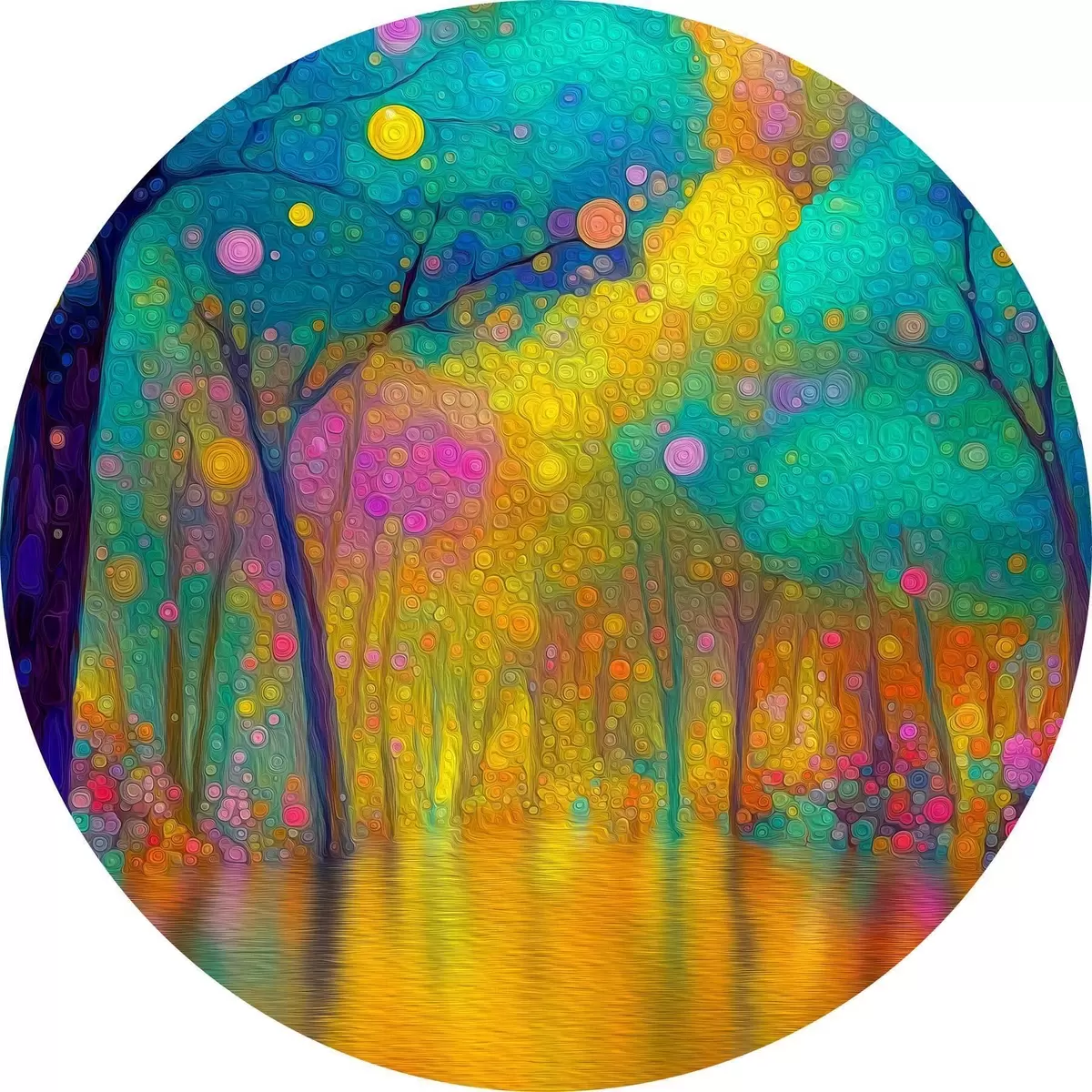 Ronde schilderijen Levendig fantasiebos met weerspiegelingen in het water Nr r46171