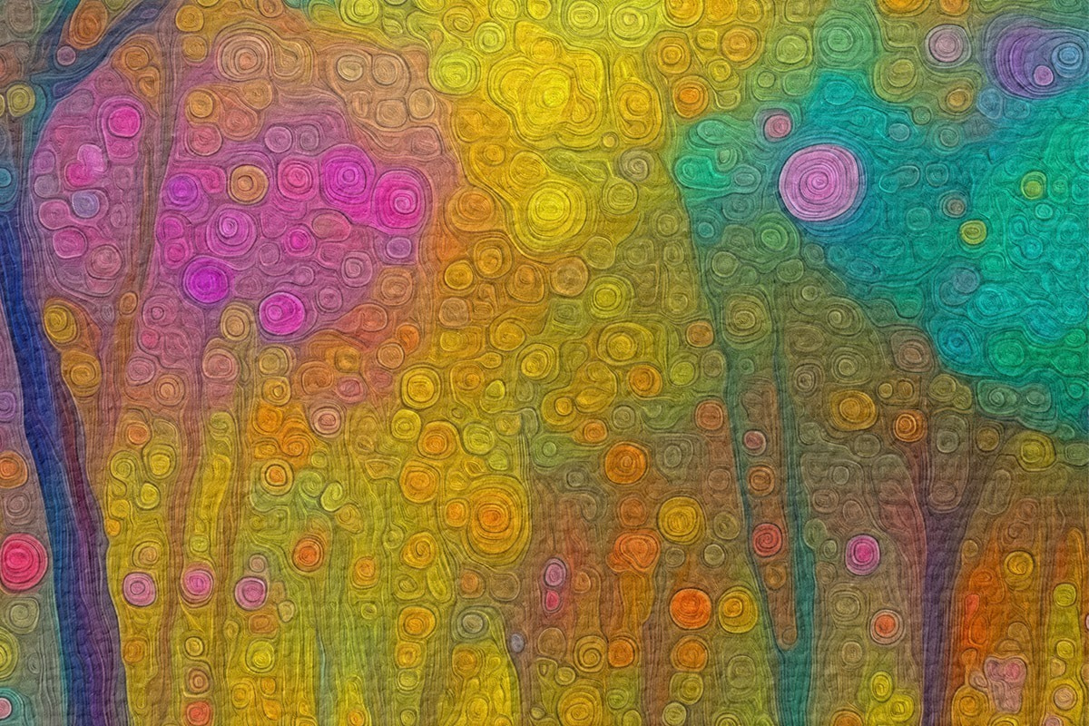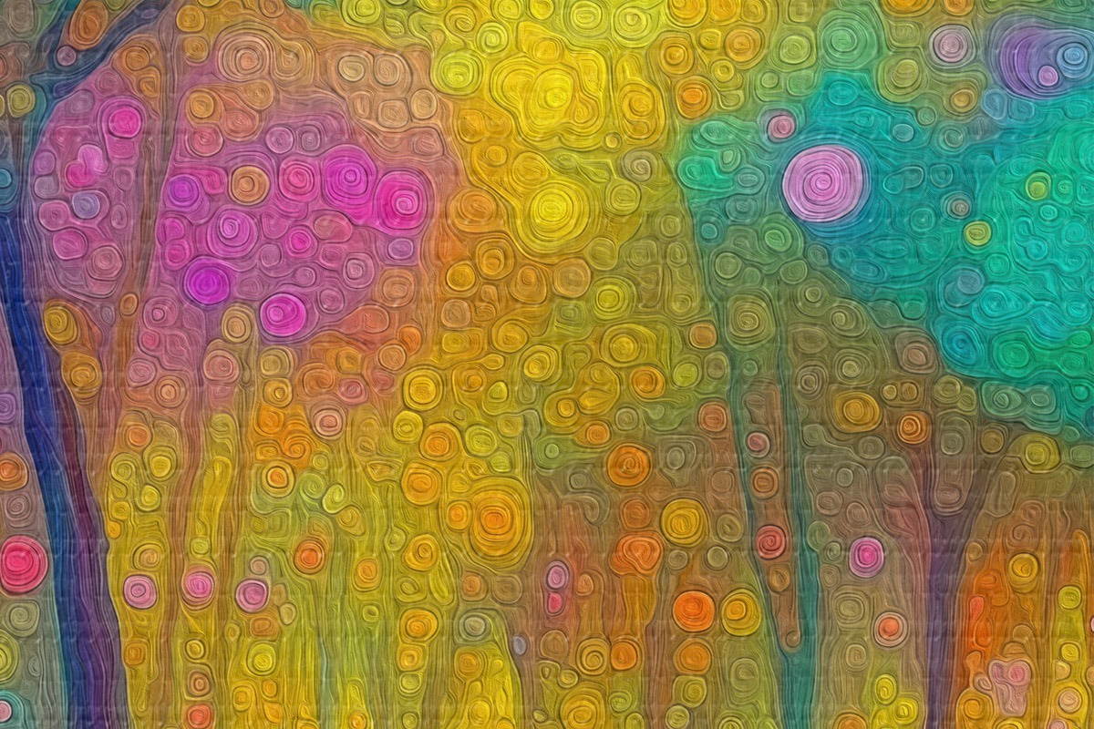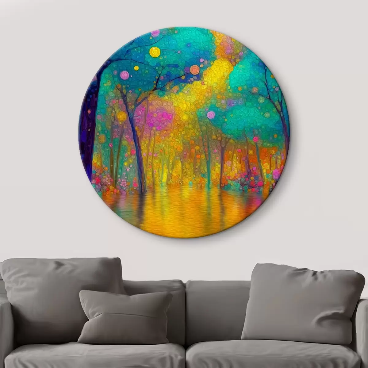 Ronde schilderijen Levendig fantasiebos met weerspiegelingen in het water Nr r46171