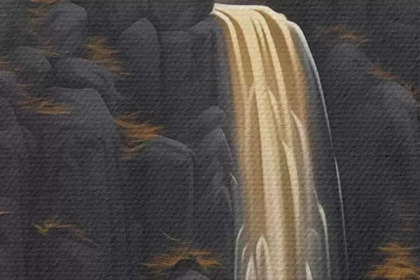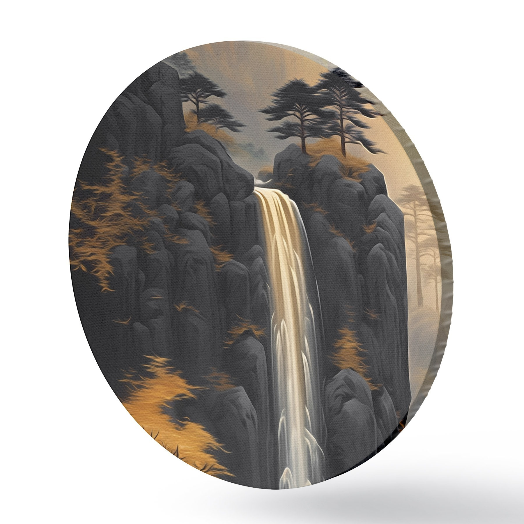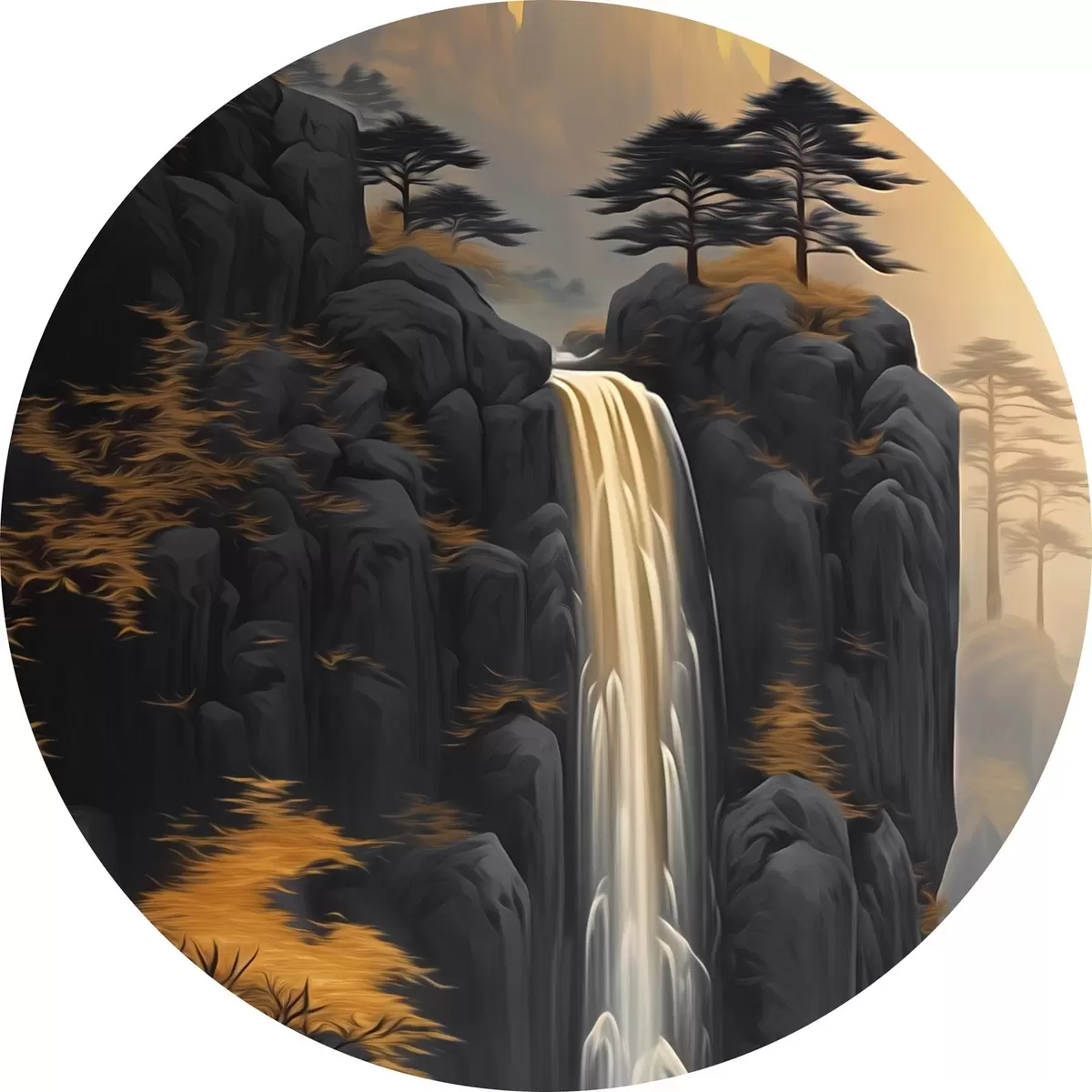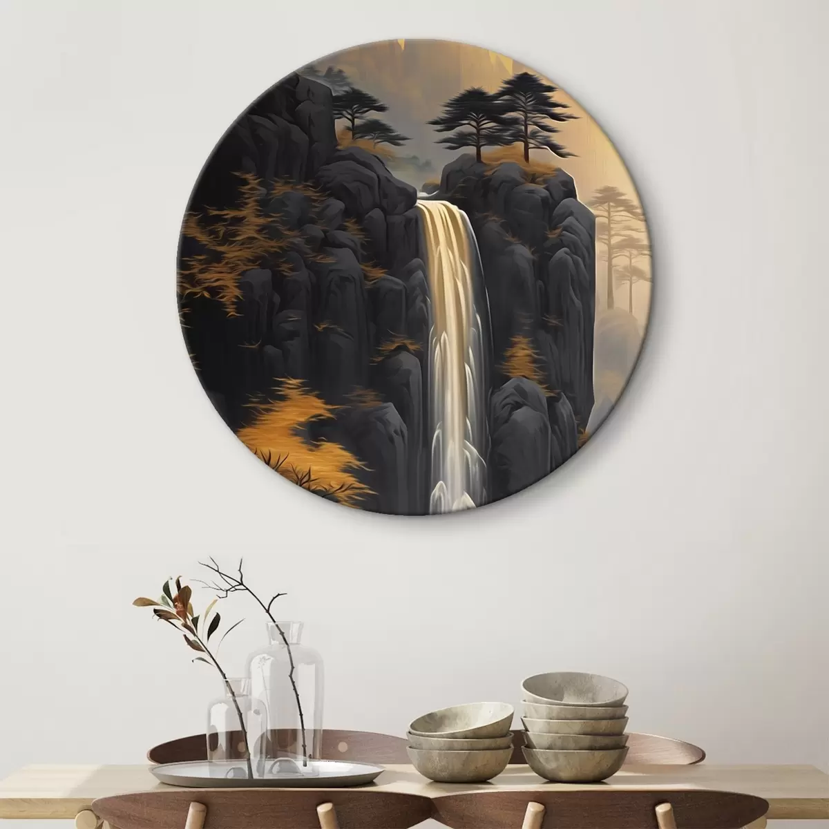 Ronde schilderijen Rotsachtig landschap met een waterval in warme zonsondergangtinten Nr r46177
