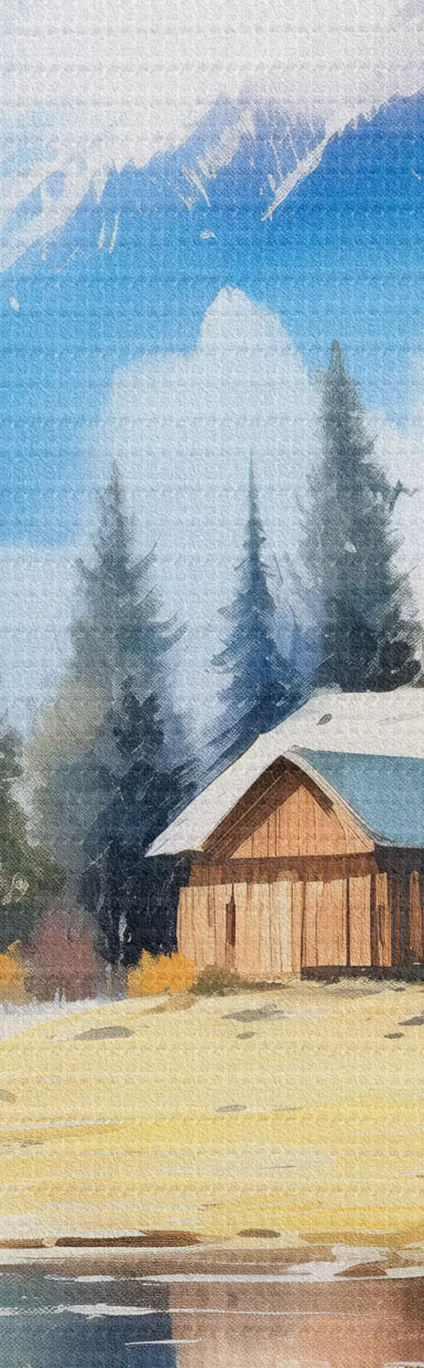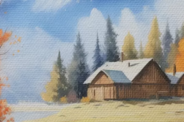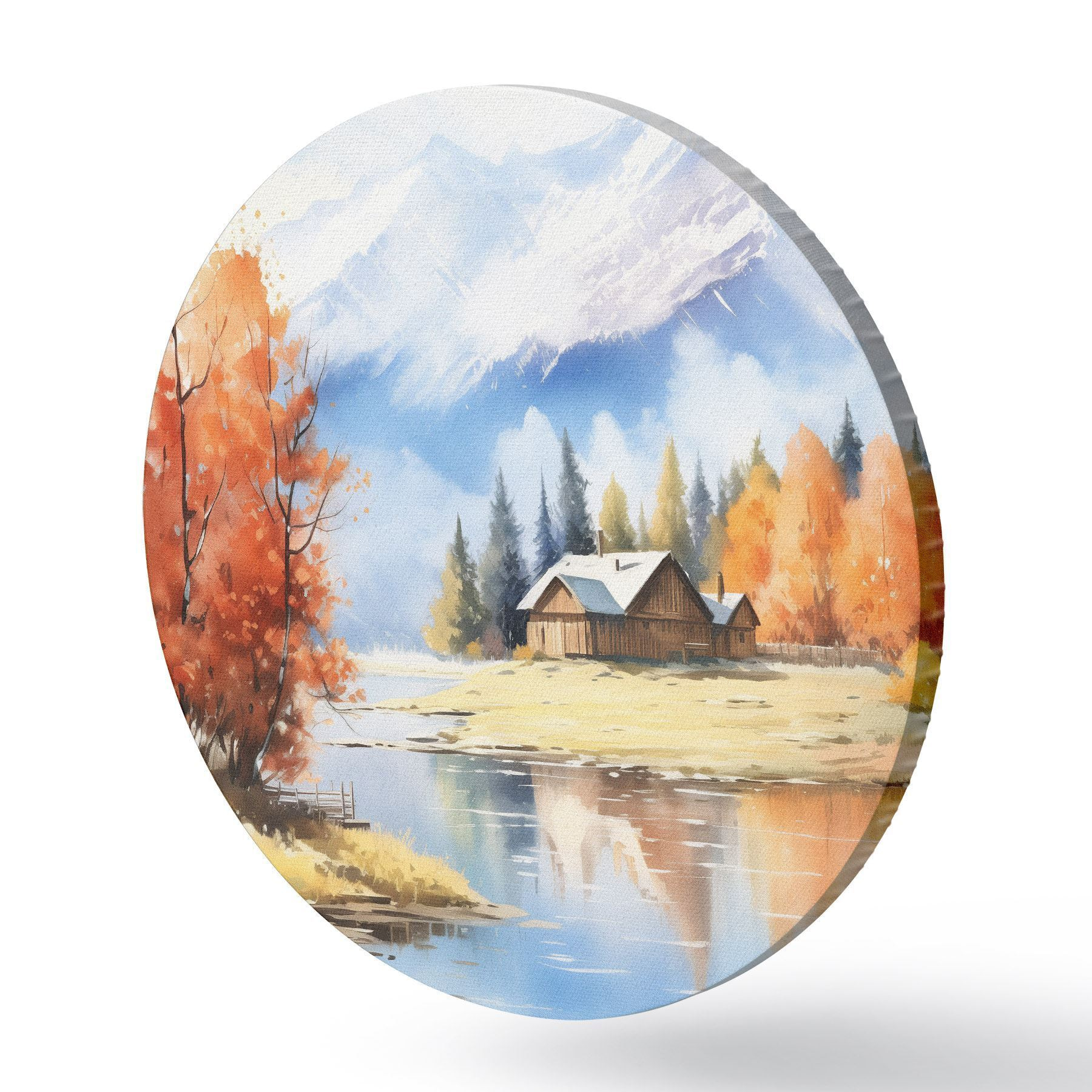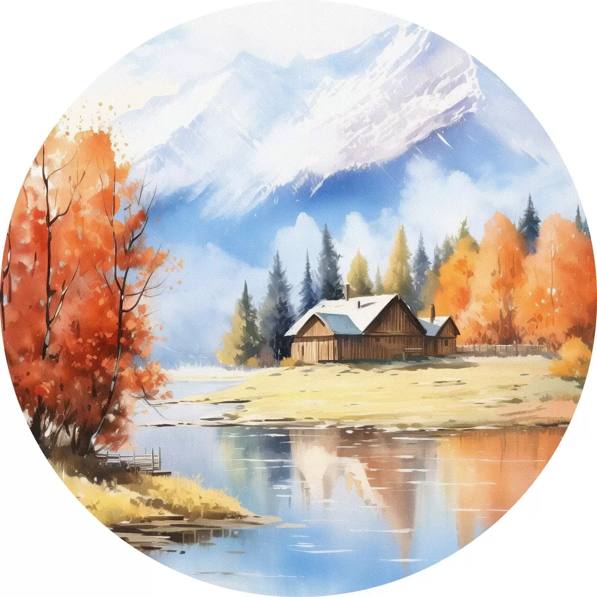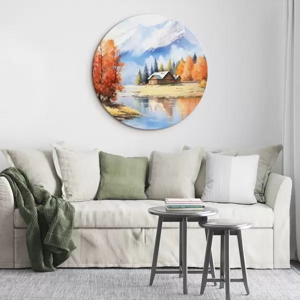 Ronde schilderijen Herfstlandschap aan het meer met een huis en bergen Nr r46184
